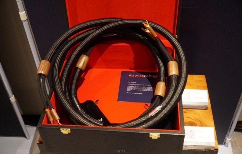 除了正在演示的整套器材使用外,現場擺放了不少Swisscables線材靜態展示。Swisscables三大系列有部分共同特點,包括使用特殊的銅合金 UP OCC,外側使用天然纖維包裹導線。線材內部的幾何結構需要根據線材的長度設計。由於導線包覆於天然纖維軟管中,內部的空隙僅有空氣,因此能夠起到良好的絕緣作用。此外,兩端線材的插頭減震器都使用了木材。