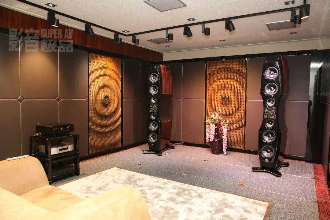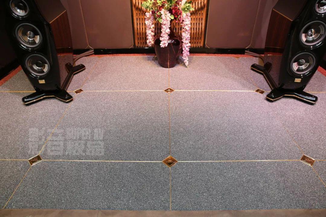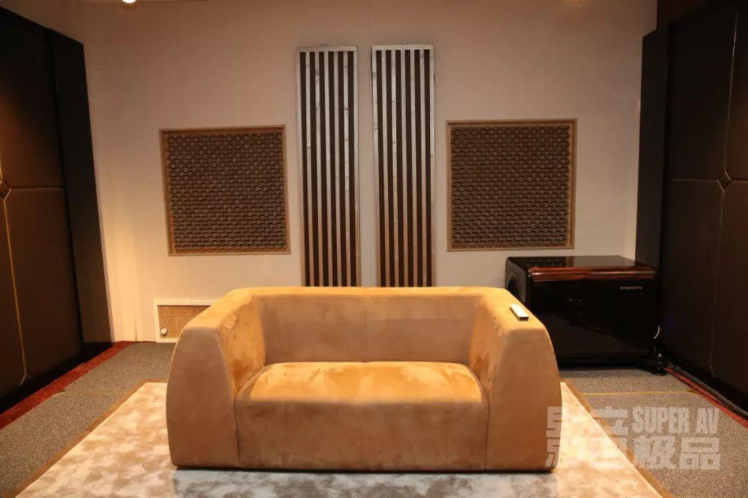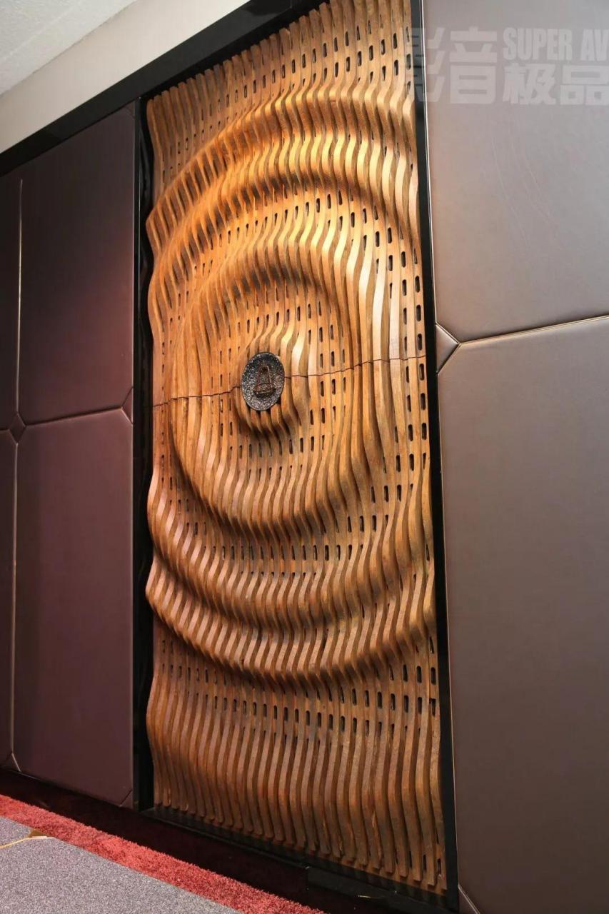 不知道大家是否有留意當中的聲學擴散板,當中有不同的波紋形狀,就如同一個漣漪的裝飾,其實這個是KHARMA特別為音響房間設計的聲學障板,材料據Charles稱為「Bamboo」的木材打造,在聲音的擴散上有更好的聲學表現,同時地面也有金色的KHARMA商標,這些聲學構建都是KHARMA聲學定製的項目,未來可以根據影音愛好者特別定製這些聲學結構的房間,只要用家提供所使用的聽音室實際大小的面積與牆體高度即可。
