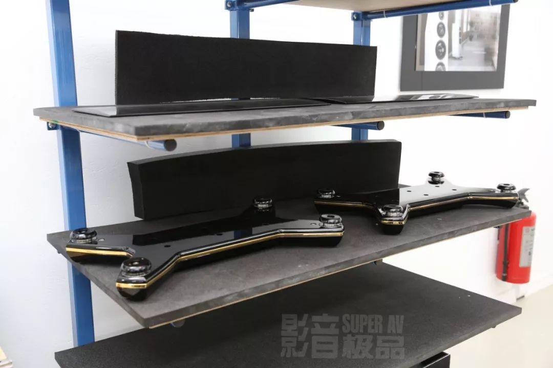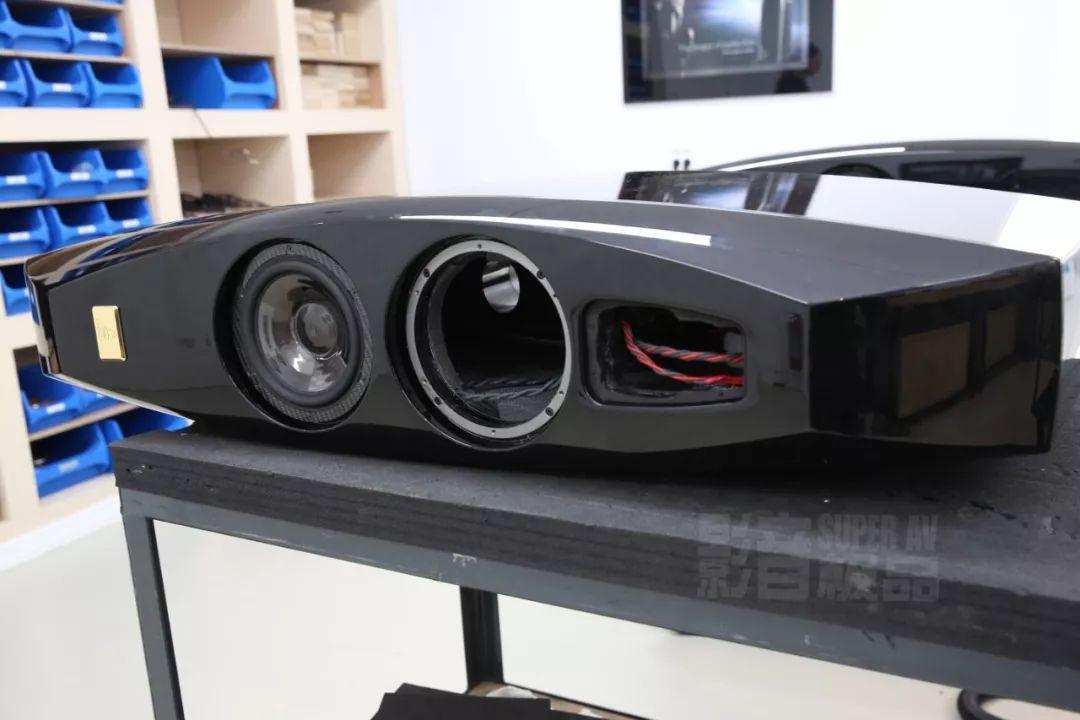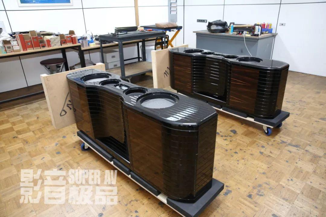 材料製作好之後,由於過於堅硬,需要特殊切割,這種HPL的物料十分堅硬,成本比一般MDF貴20倍以上,切割必須用到特殊的CNC機器加上鑽石刀具方能切割,據說切割的機器要價就達到7百多萬歐元。切割好的配件需要整塊黏合固定後的箱體準備進行塗漆,需先打磨並上一層底漆。而在動用另一套CNC開板機,用來切割較小的配件板。各種配件如側板、底座等也要經過同樣的工序處理。由於材料非常堅硬,也導致箱體如同磐石,內部支架已經顯得多餘和阻礙,相反的是內部增設眾多專業吸音棉。對於同樣採用MDF板材的箱體,使用這類型材料的箱體非常沉重,如果要搬動擺位,絕對讓人感到頭皮發麻。KHARMA如此大容積的箱體究竟是如何挖削製作的呢?其實絕非靠一個大物料進行挖削處理,而更多是通過「片式」擠壓成型,有點像3D打印的切片分解,通過一片片鏤空的片子疊加成型立體,成就了例如早期Grand Exquisite的碩大箱體。
