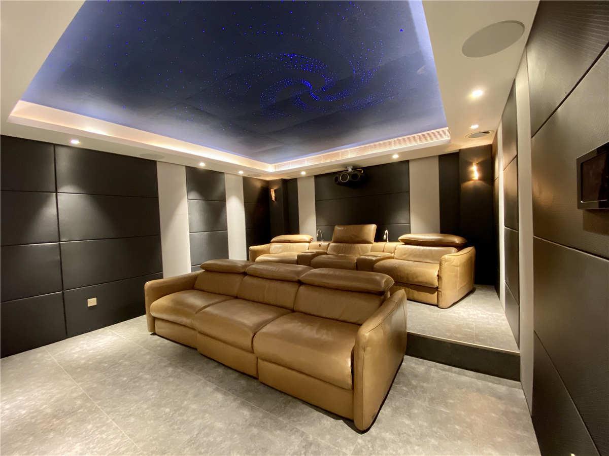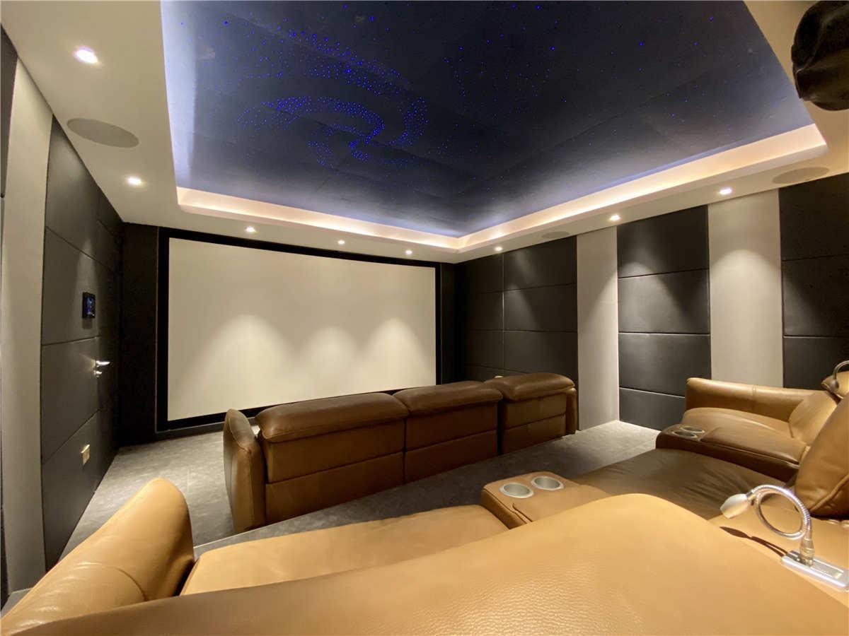 这个展示厅在风格设计上显得简约而稍显豪华,不会去布置任何复杂的线条,也不会搭配太过杂乱的色彩,在主色调上基本为黑白灰中性色彩,在配以显豪华感的沙发以及迷人的星空顶,满足了现代人的审美需求。设计师将所有的扬声器隐藏于墙壁内,在达到了影院般的声音享受的同时又让空间成为一个完整的整体,不会有任何影音设备暴露在视野内,给人的是舒适惬意的影音家居设计。展示厅做足了声学处理,声学处理不仅仅是为了隔音,更是为了给用户提供更好的观影感受而存在。然而,为了最大程度发挥音响系统性能,我们往往注重音响器材的搭配、摆位和声学处理的诸多细节,这也在一定程度上对房间的美学处理造成了一定干扰。那么这个案例很好的解决了这个干扰,不仅美观而且声学处理得当,兼顾了声学和美学,不仅好看而且声音效果很好。合理的布局,舒适的环境,总是让人赏心悦目,加上醉人的音乐,当是一种妙不可言的享受。