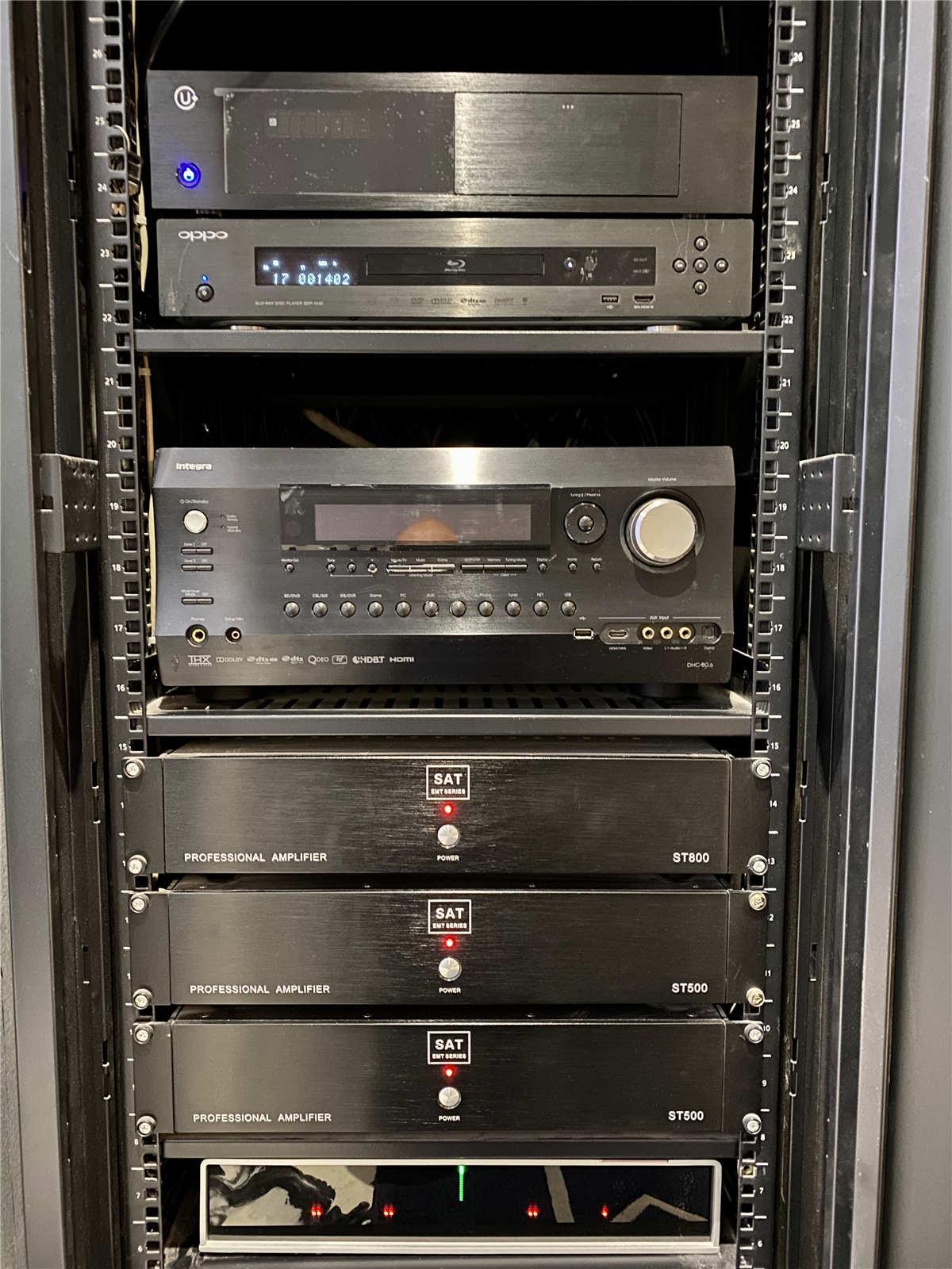 本案例的影音器材自然是重中之重,首先是整个全景声影院的处理中心,本次采用的是Integra DHC-80.6,在美国的家庭影院定制安装市场中,Integra所带来的一系列AV放大器与前级处理器产品凭借出色的定制安装特性与不俗的性能而深受用户的喜爱。面对Dolby Atmos普及浪潮来袭,Integra也推出了一系列相关的放大器产品,而DHC-80.6就是当中旗舰级别的前级处理器。DHC-80.6是一款11.2声道的前级处理器,也就是说最高能够建立一套7.2.4或9.2.2的Dolby Atmos系统。DHC-80.6兼具THX Select2 Plus认证与ISFccc认证,具有丰富的音视频调校功能,同时配合AccuEQ房间声学矫正系统,用户可以更加轻松地实现智能控制。在音频解码方面,配合双32bit DSP处理器。而控制方面则是DHC-80.6的强项,不仅可以通过各种各样的智能移动设备进行操控,还具有众多用于智能集成中控系统的传输端子,实现全宅智能化的影音控制。Integra DHC-80.6 11.2声道杜比全景声就绪网络AV前置放大器 从固态合金面板,以镀金XLR预奏时,DHC-80.6散发出高保真的品质。 三重变压器功率尖端处理技术杜比Atmos®影院音响或者多区域AV娱乐。DHC-80.6有点十分多:支持Dolby Atmos杜比全景声音频解码、可组建7.2.4与9.2.2 Dolby Atmos系统、THX Select2 Plus认证、HDMI 2.0标准音视频传输端子、AccuEQ房间声学矫正系统。
