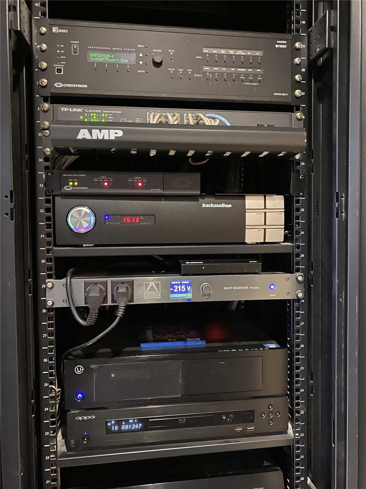 在侧环绕和后环绕之中,采用的是统一的型号,为Starke Sound IW-H3 Elite,总共有6只扬声器,IW-H3 Elite的设计同样颇为精美,拥有全金属的结构,整体CNC一体成型的高硬度7系铝合金面板,高至300W的功率承受能力和强悍的动态,诸多Starke Sound独门技术应用于IW-H3 El ite的单元,顶级电容电感电阻打造的三阶分音器,IW-H3Elite频率响应为42Hz-27kHz,承载功率达到40-300W,阻抗为4欧姆,灵敏度可达90dB,高音为1英寸丝膜球顶IMF高音,中音为4英寸碳纤IMF中音单元,低音为双6.5英寸 增强复合纸膜IMF低音单元,分频点在300Hz/2900Hz,单只重量为15kg。在置顶4声道中,采用的仍然是美国Starke Sound AO65 嵌入式扬声器,AO65是Brio系列中占用面积最小的一只,适合做天空声道,以及无处不在的背景音乐。和其他诸多类似的吸顶喇叭相比,AO65最大的特点就是更小的体积,更大的动态。在小面积影音室的天花,AO65可以让天空声道安装更加容易;对全宅背景音乐来说,AO65可以使背景音乐系统拥有更大的能量,AO65采用的是1英寸丝膜高音配6.5寸金属陶瓷中低音的方式。在超低音中,采用的是2只美国Starke Sound SUB120有源超低音以及2只美国Starke Sound SUB150有源超低音。Starke Sound SUB120是一个RMS功率450W,峰值功率900W的12英寸超低音,下潜可达23Hz(-3dB),采用密闭式设计,重量为18kg,Starke Sound SUB150则达到了更为厉害的1500W功率。