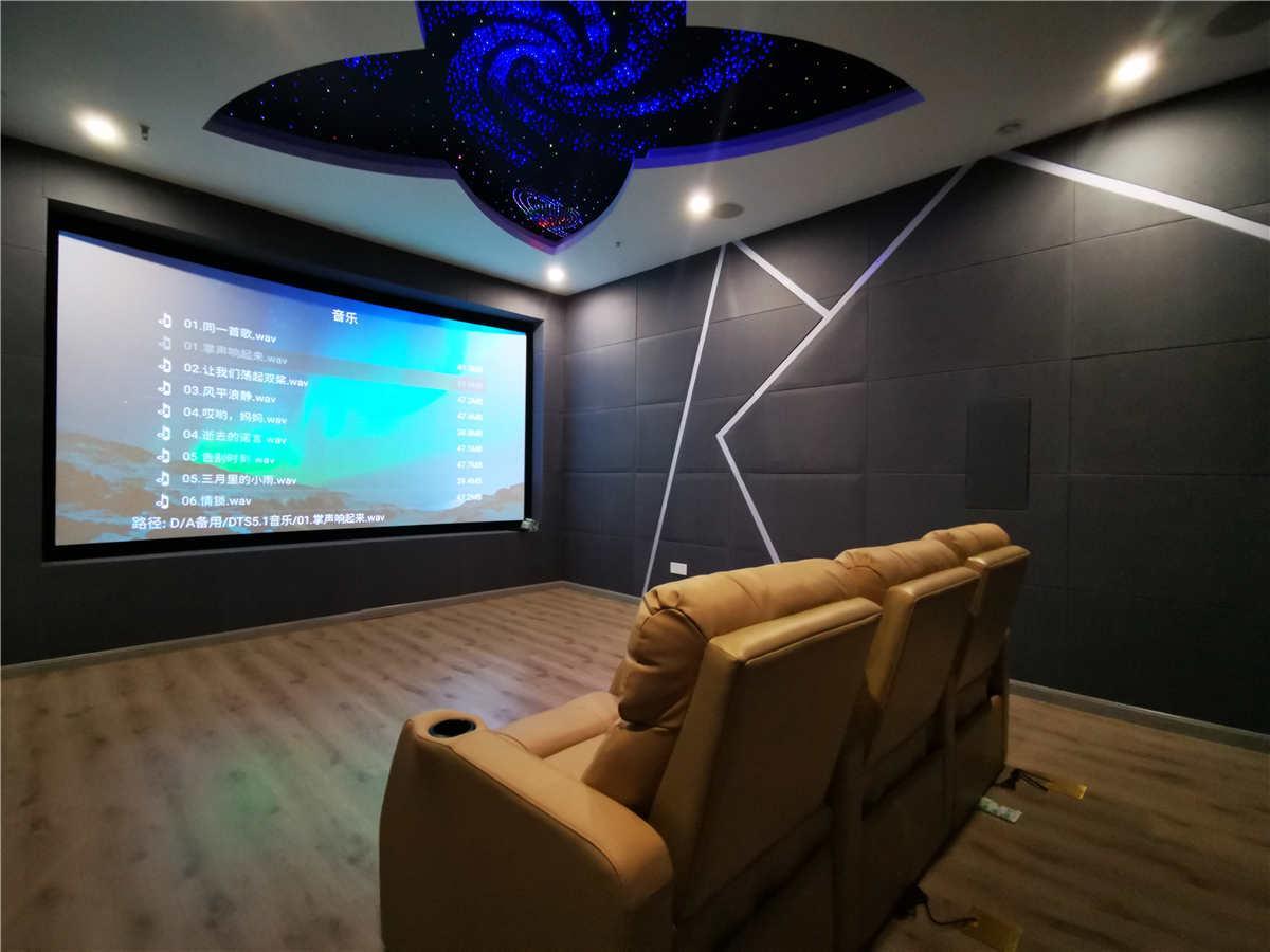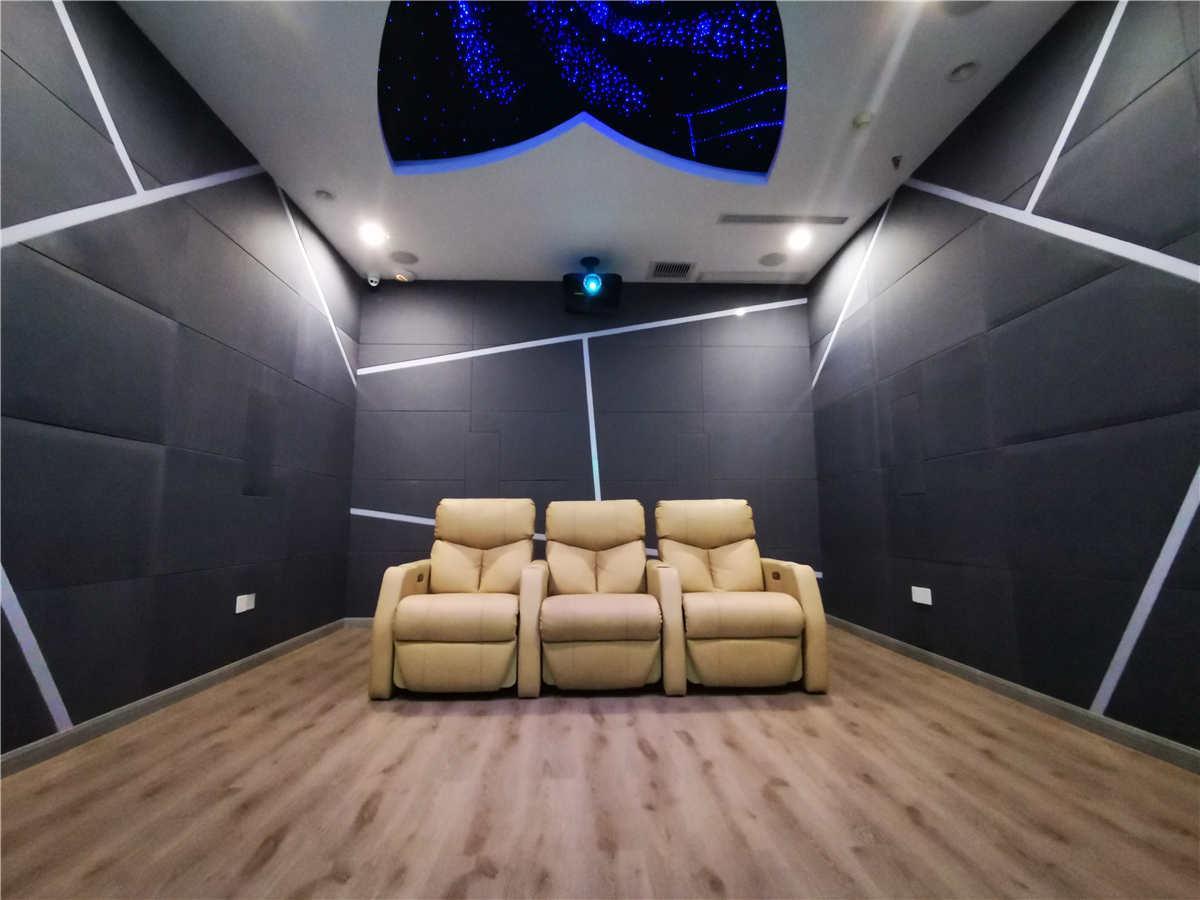 因此设计师打算通过墙体的改造及顶部减震隔音处理从而来达到声音隔绝的效果。在该影音室中,设计师在左右两侧墙面前部分均放下吸音棉,吸收部分中高频。而四个环绕音箱周围均是扩散体,通过它的立体表面对音波进行不同角度的传导,消除音波在扩散过程中的盲区,起到了改善音质、平衡音响、削薄重音、削弱高音,以及对低音进行补偿。同时为了抑制驻波,设计师在前置音箱两侧放置低频陷阱,墙面地面做软处理,把反射声波变成漫反射,从而来提升包围感。通常情况下许多设计师都会选择将家庭KTV融入到私人影院之中,但众所周知,KTV的混响要求和影音室的混响要求是大不相同的,为了达到二者都相对较好的状态,因此,在设计该影音室的时候,设计师果断放弃了将家庭KTV融入其中,从而来还原一个私人影院的最佳效果!