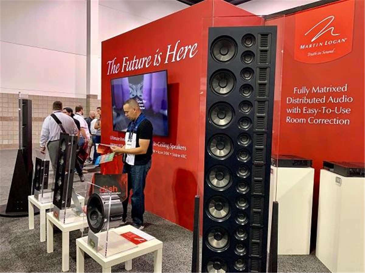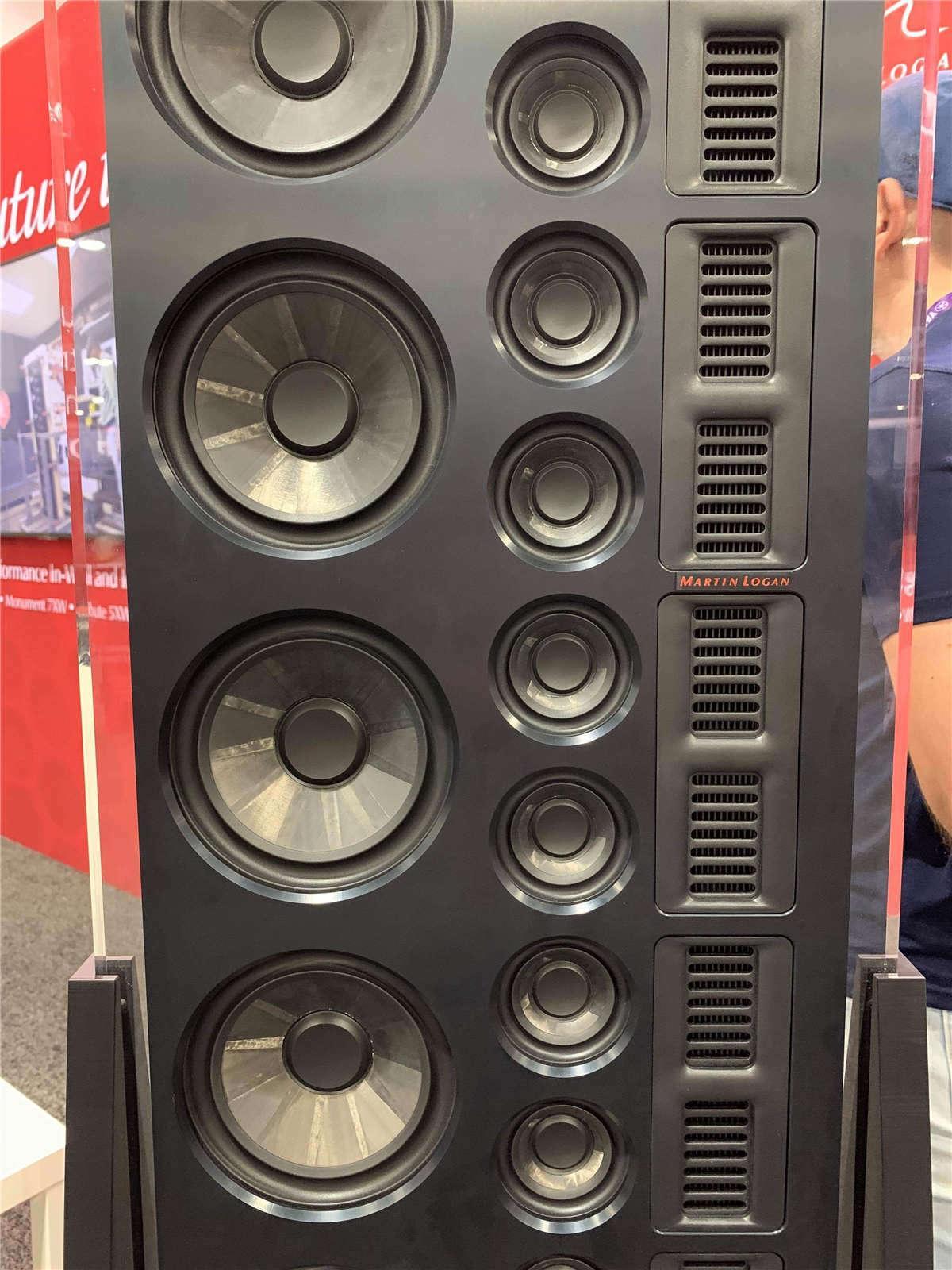 MartinLogan研发实力相当强,全新推出的Masterpiece CI系列扬声器包括四个入墙式扬声器和一个吸顶式扬声器,每个扬声器都拥有MartinLogan的Folded Motion XT Obsidian高音,还有碳纤维多段锥体的中音和低音单元。Folded Motion XT Obsidian高音振膜极其轻量化,对比普通球顶单元同样的声压振幅会更低。图中超多单元的入墙式扬声器为Statement 40XW,足有40个单元在高声压下维持极低失真。16个高音、16个3.5英寸中音以及8个6.5英寸低音,轻松满足大空间使用。
