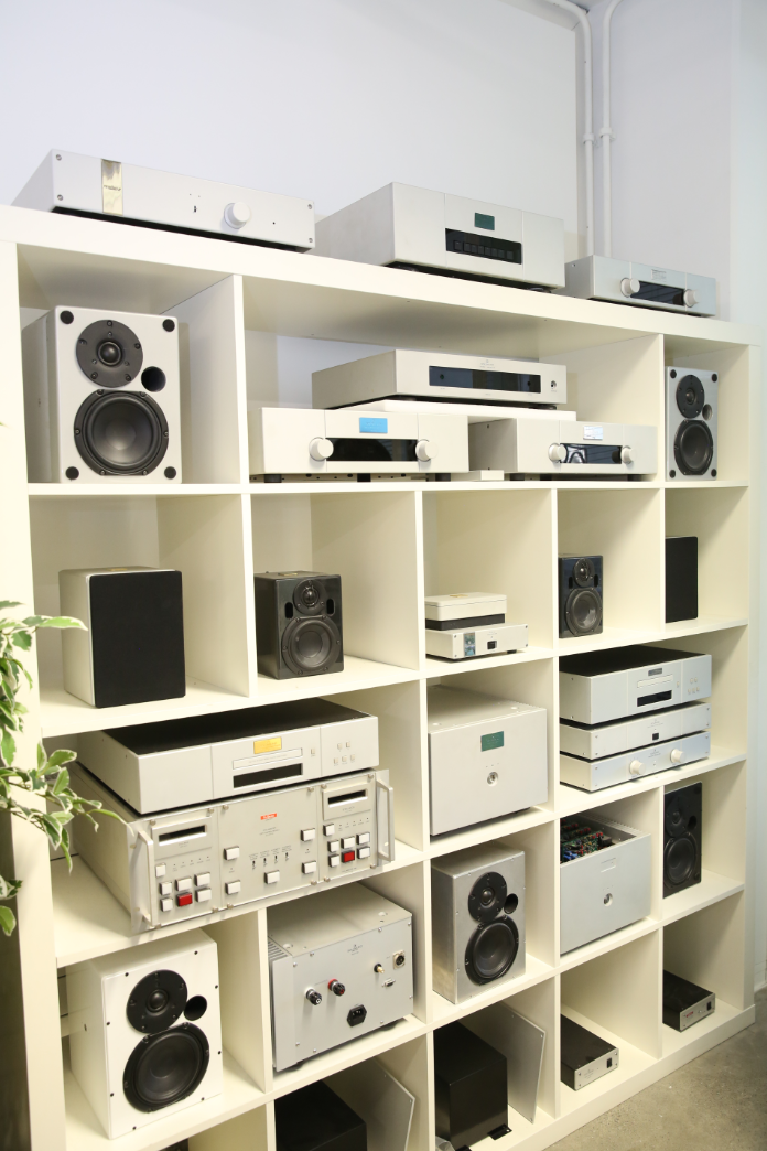 办公室一角也非常独特,这里摆放着Goldmund历年来推出过的经典机器,包括有合并机、单端放大器、前级放大器、书架扬声器等等。可能大家都认为Goldmund只专注生产放大器,其实它们也有非常多的扬声器选择,比如最小的Micrometis Passive书架式扬声器,就像它的所有兄长,依旧采用航天级铝合金制作箱体,以取得最强的箱体结构与最低谐振。Micrometis Passive全机外表找不到一颗螺丝,正纳闷它是用什么方法固定音箱箱体的板件,原来是采用特殊高科技接合胶,省却螺丝,不仅赋予其更简洁的外观,还可提供适当的阻尼效果。