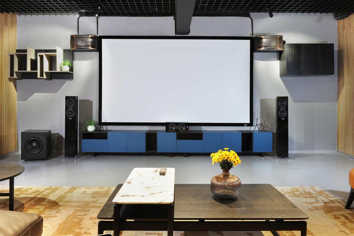 整个地下室大致被规划为桌球区、瑜伽休闲区和多功能影音室。整个空间娱乐设备一应俱全。因为考虑到朋友聚会总喜欢唱唱歌,平时家庭看看电影、听听音乐。所以为了满足F先生的需求,整个影音空间做了卡拉OK系统和影院系统兼顾设计。今天我们着重介绍一下其中的影院系统。