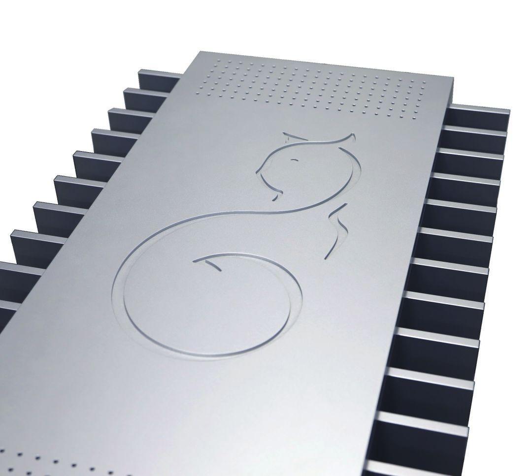 除了前面板外,机顶也有“猫”的图案,这是Danish Audio Design所专注的设计特点。这款DAC 75和PRE 75前级放大器的诞生为取代DAC 15和PRE 15放大器,并添加现有400 Silver系列的一些崭新的功能,如全新的遥控、更加时尚的外观、平衡音频获得更好的组件。按照Jan在展会上的介绍,DAC 75和PRE 75当中用料可谓十分讲究。两款机器都具备标准版和Special Edition版本。标准版本采用飞利浦电容和纯银的内部接线,顶级和高端的元件对满足发烧友严苛的耳朵显然不成问题。DAC 75和PRE 75具备XLR真平衡接口,对有更为发烧要求的玩家提供了众多的延伸。DAC 75解码采用规格高达32bit/384kHz,对应众多主流的PCM音乐文件。