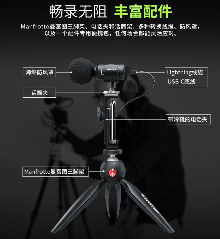 其次,舒爾MV88+便攜視頻錄音套裝(內含AMV88-FUR防風罩),豐富的環境場景攝錄模式,高效過濾講話和環境風噪,便捷靈活的移動性,讓錄音變得更加清晰和簡單。