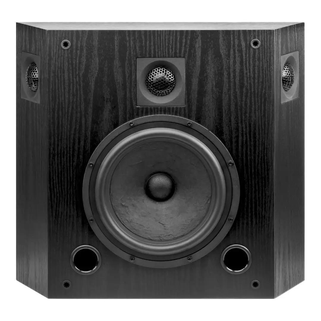 關於環繞聲,我有一對S8T。這些揚聲器是Tripole三面發聲設計,使用了8英寸長木纖維低音單元,它們在每個梯形側面配備了前向發聲的1英寸絲膜球頂高音揚聲器,頻率響應是和S81相同的40-30kHz,阻抗同樣為4歐姆,靈敏度等級為90dB。箱體尺寸為14.9「×16.3」×4.9「(HWD),重量為21磅。