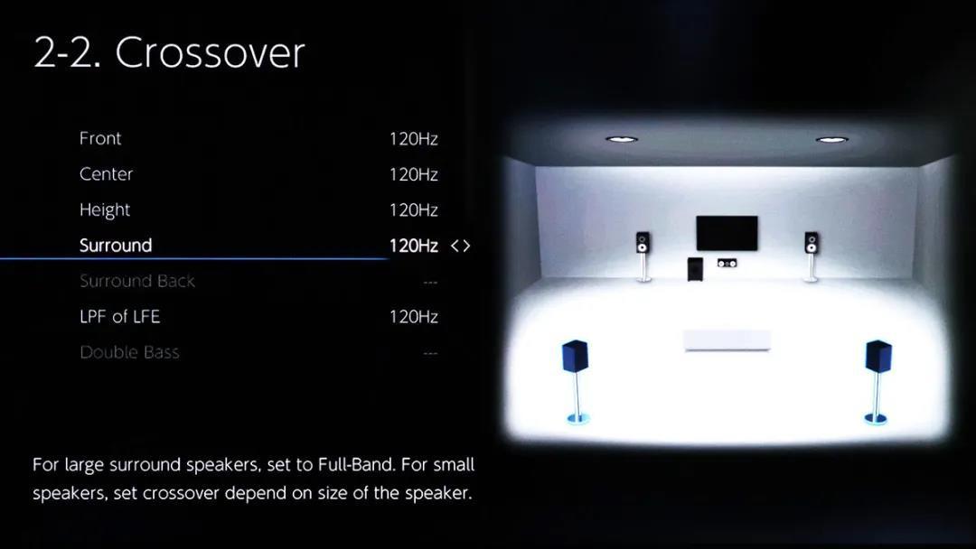 完成自动更正之后,可将「分频点」(Crossover)设定为「Small」/「120Hz」或更高,又或者设定为使用喇叭规格上显示的频率响应数值,将数值以下的低频信号交由低音炮负责处理和输出。