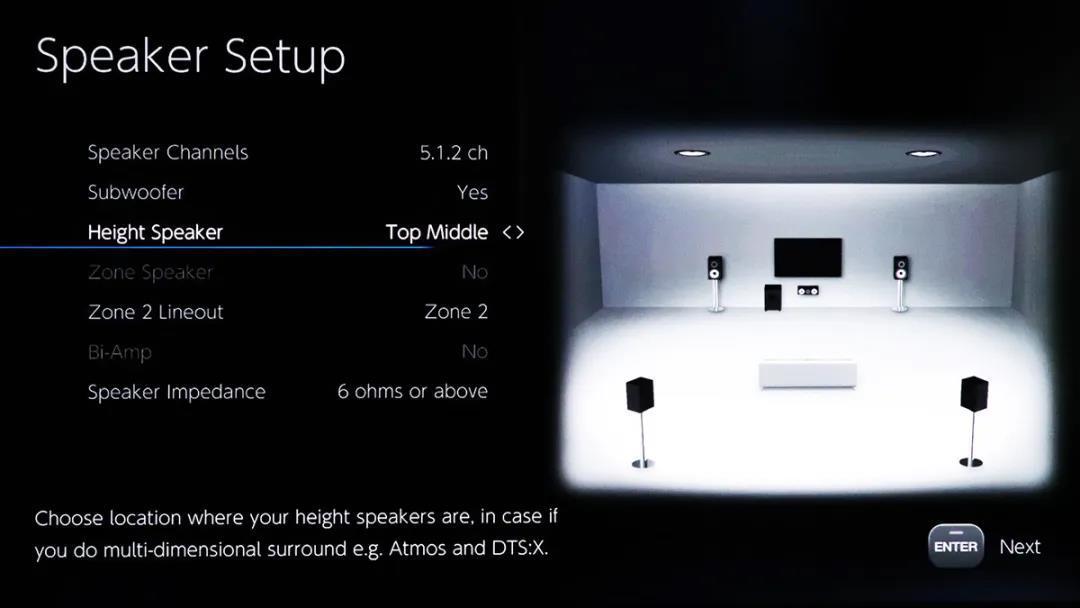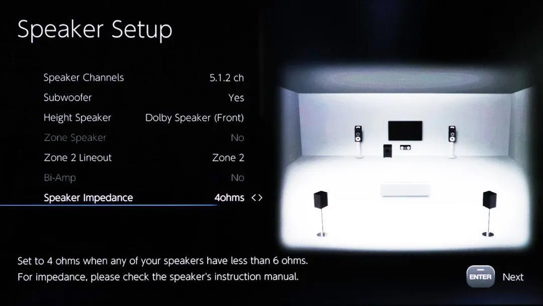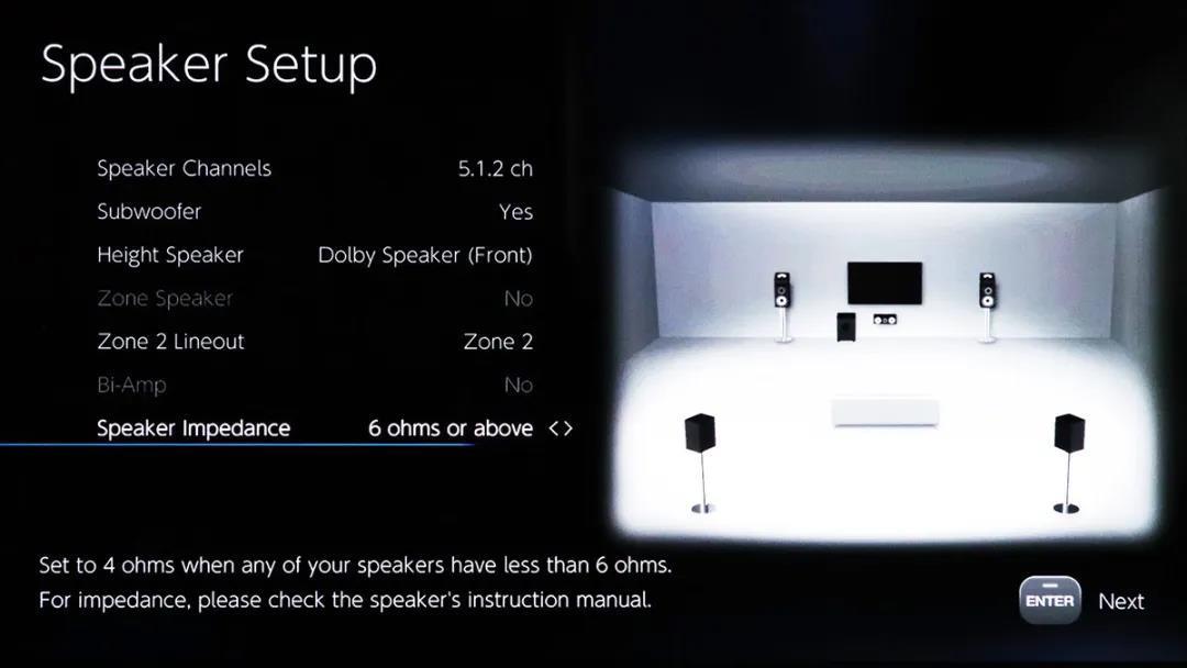 进入「设定」(Setup)菜单中的喇叭(Speaker)→ 配置(Configuration)选项,选择要使用的喇叭布局(Layout)。以比较常见的「5.1.2」为例,第一个数字「5」为主层喇叭数量,第二个数字「1」为低音炮数量,第三个数字「2」则是顶置喇叭数量。「阻抗」(Impedance)可根据喇叭规格设定,如果全部喇叭均为「4ohms」就可选「4ohms」,而若果喇叭阻抗不统一,则建议选择「6ohms or above」。之后可以检查「Level」选项,以确定所有喇叭包括低音炮是否根据其对应的声道正确接线、声音是否可以正常输出。