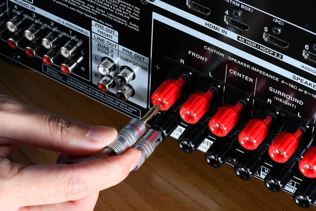 第一步当然就是要做好基本的接线,将电源、喇叭、HDMI 线都连接好,电视有功放的画面输出,然后先看画面,进入功放菜单来做调校和设定,并使用电平校准确认每一个喇叭能够出声,同时红、黑线要对准相应的接线柱。