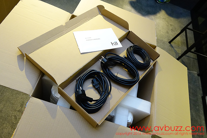 Ricky Chan 这一边开始拆出喇叭付件,由于 Kii Audio ” THREE ” 属于有源喇叭,提供两条电源线是理所当然,还有一条 LAN线的出现,是用她来连接左右喇叭。