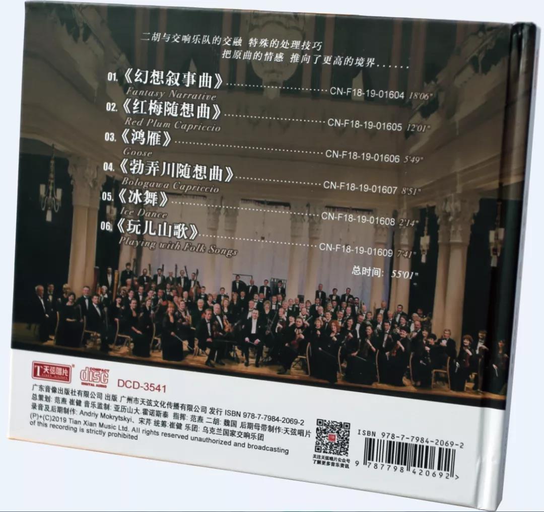 说回这张唱片,很多朋友问我,这民族乐器的协奏曲,似乎很少在现场听过,笔者就曾经在中俄文化年的内部演出中,听过由俄罗斯指挥大师费多谢耶夫伴奏的天团柴可夫斯基交响乐团与民族乐器的演出,那都不少公开售票的,所以像这样的国外交响乐团搭配民族乐器的录音,确实也可以看出级别不一般,费多谢耶夫虽然懂五线谱,更懂交响乐总谱,据说他自己还作曲,可是在中国民族乐器的演奏法上,他可能懂的还没有我们这张唱片中指挥家范焘那么多。天弦唱片一直在推广中国优秀交响作品上不遗余力,包括《幻蝶》、《天弦》等一系列经典的发烧作品都是最好的佐证。现在都在提倡怎么样讲好中国故事,从这张《丝路弦韵》就能看出来,像《鸿雁》、《红梅随想曲》、《玩儿山歌》这些的选取选材,就可以看出整个制作团队的“别有用心”!虽然说这些都是新作品,可是素材还是那些不陌生,而且传统接地气的素材,这些作品证明,我们国家的音乐家们,既懂得写中国民族乐器,也能写西方交响乐曲,更能写好中西合璧的协奏曲,要知道在平衡独奏民乐和庞大的交响乐队之间的音响关系,有时候不光是要靠天赋,而且也要靠实践,实践从哪儿来?我相信,他们起码熟悉西方交响乐队,也经常泡排练,这就是实践的来源。像这张唱片里的《冰舞》,这是演奏家魏国创作的,为了更好展现运动员在冰上的优美舞姿,魏国把小提琴的演奏吸收到二胡的演奏技巧中来。我相信除了实践之外,这也要靠一点点想象力。我估计录音时他的演奏绝对把身旁那些交响乐团里的小提琴演奏家们吓坏了!希望这样别有用心的唱片越多越好!