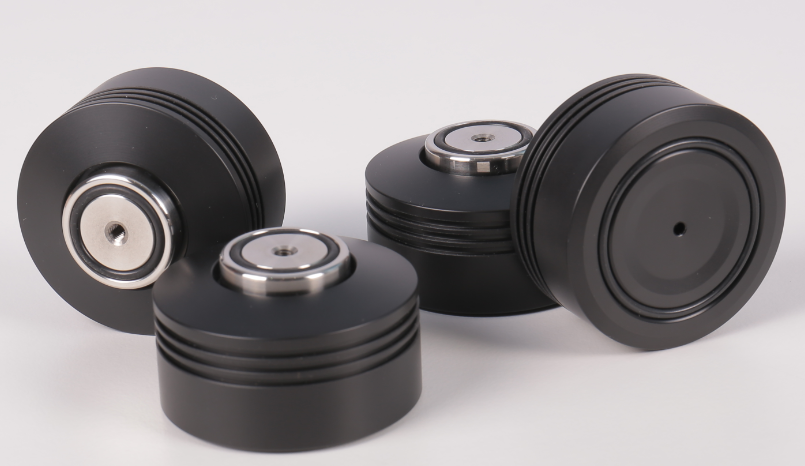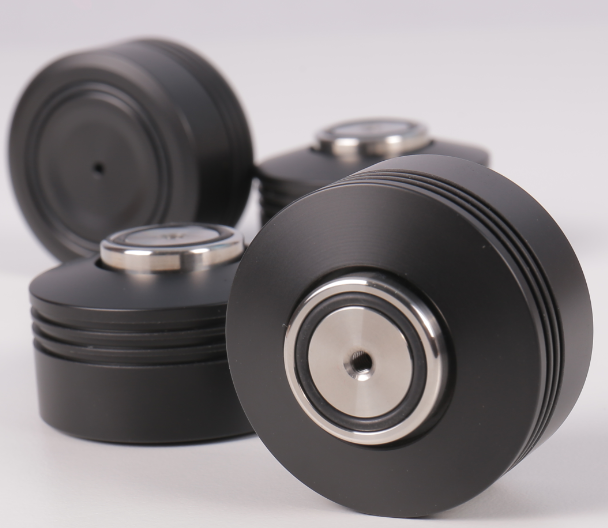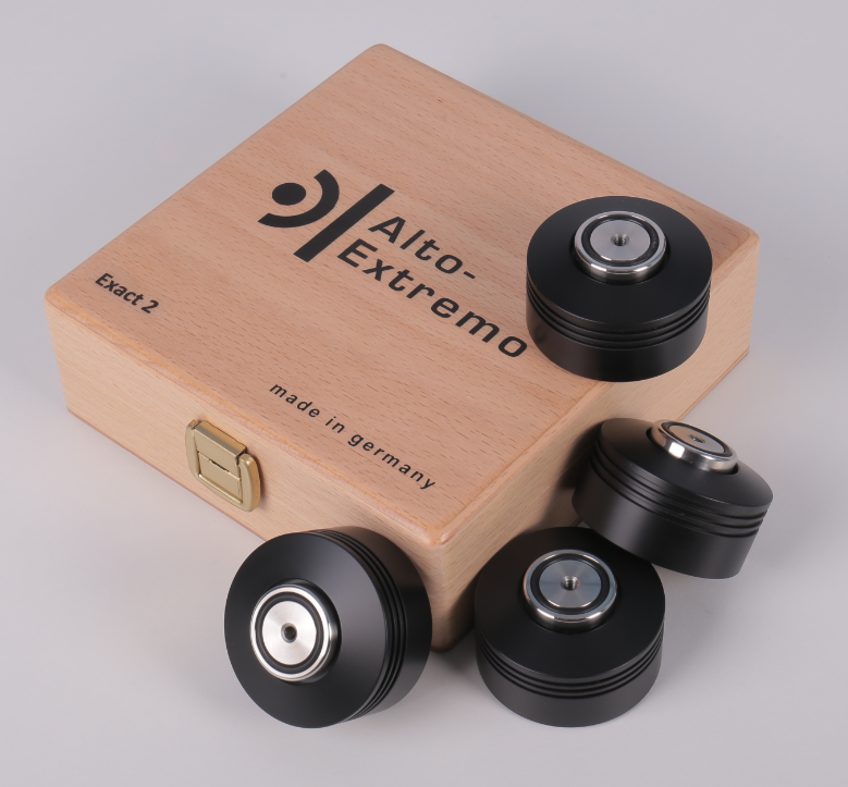 大部分的书架式扬声器都配置有专门的脚架,许多座地式扬声器也附有专用脚钉,我们使用机架、器材垫板,甚至有“吹毛求疵”者在线材上也动用到托架。实际上,这些小玩意、小附件的应用并不是我们钱包富余,无的放矢,恰恰是因为震动对系统声音的影响,减震避震是解决这个问题的有效举措。德国的Alto-Extremo在很早前我们便开始接触,这是一个颇具针对性的附件品牌,当中“吸震脚”就是他们的拿手好戏。最近收到上海名曲寄来的一套Alto-Extremo EXACT 2吸震脚,这是2020年的最新型号,几个月前我们也曾试用过其上一代的EXACT 吸震脚。
