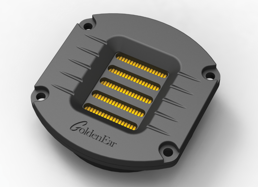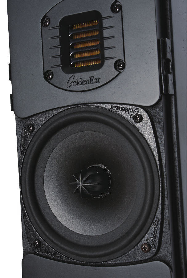 GoldenEar的高音單元具有特別的專利技術,被稱之為HVFR ( High-Velocity Folded Ribbon ),從外形上看起來,GoldenEar的HVFR專利高音單元和一般的摺疊鋁帶高音很像。對,事實上確實從原理上來說兩者是一致的。但是HVFR這個專利高音單元從製造上,分頻設計上是完全按照GoldenEar的特殊整體構架上專門來設計的,所以和整體的揚聲器特別匹配,要比傳統的球頂高音有8倍的能量。另一個就是Multi-Vanced Phase Plug ( MVPP ) 技術的中音單元,我們發現MVPP的單元錐盆都是弧形的,和普通單元完全不同,配合這個弧形的錐盆還特別設計了8角型的特別相位塞。這個特殊的弧形錐盆+8角型相位塞的特殊設計,可以讓中音具有特別的擴散效果。