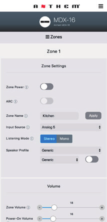 对于网页格式的控制界面,经过特殊设计、适应性超强的用户界面可以在任何设备上工作,包括根据需要设定单独的分区、信号输入分配、分区名称设定、独立调节电平和声音的每一个参数。此外,可以在相互分离的分区中独立安装和控制超低音扬声器,同时具有专用的输出端子(兼顾低电平和高电平输出,包括桥接模式),各个单独分区的设置可以针对全新的、更先进的Anthem空间校正功能(即ARC Genesis)进行调整。在每一个分区中切换ARC Genesis的开或者关,便可以听到空间优化之后的效果。