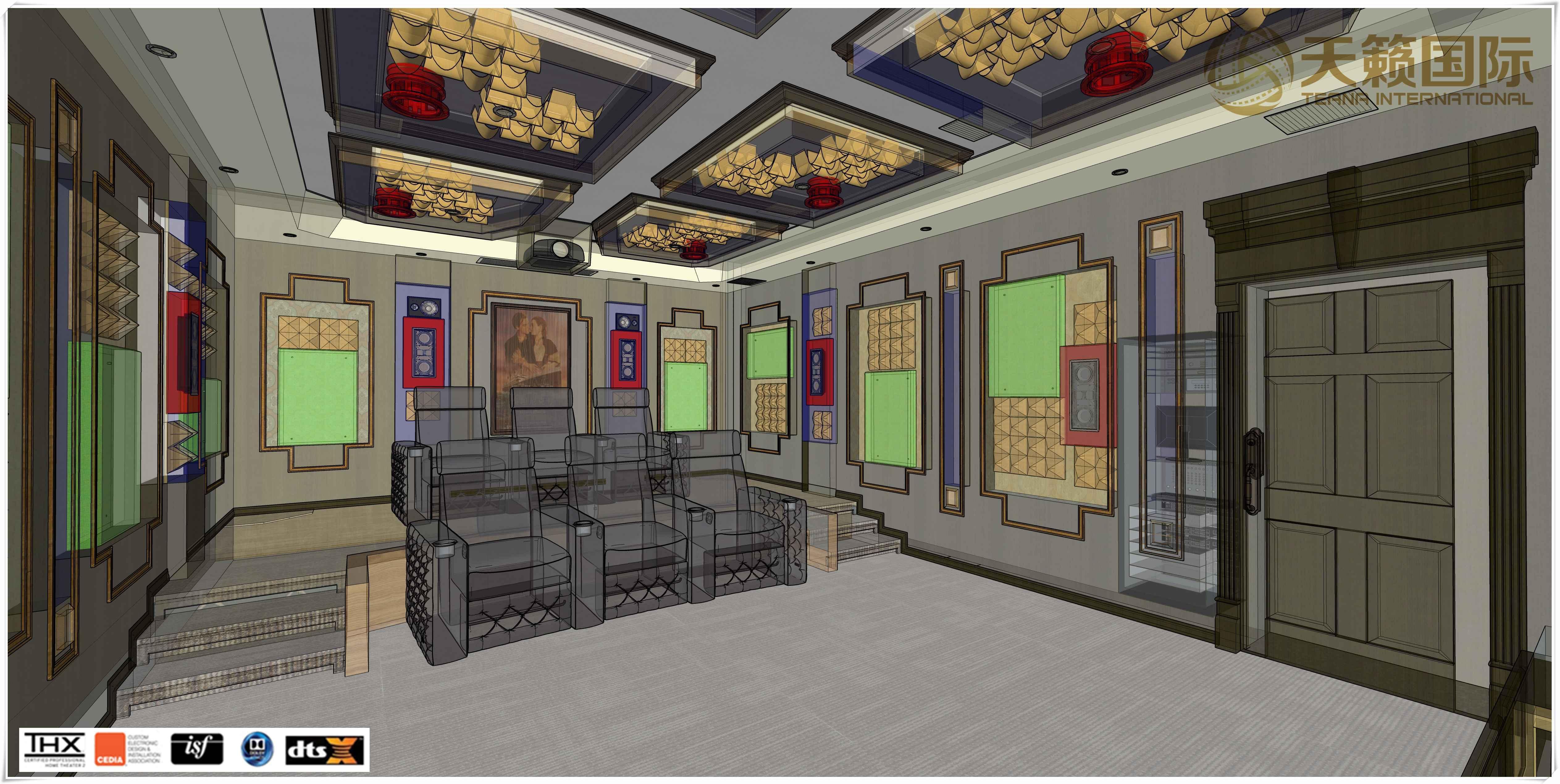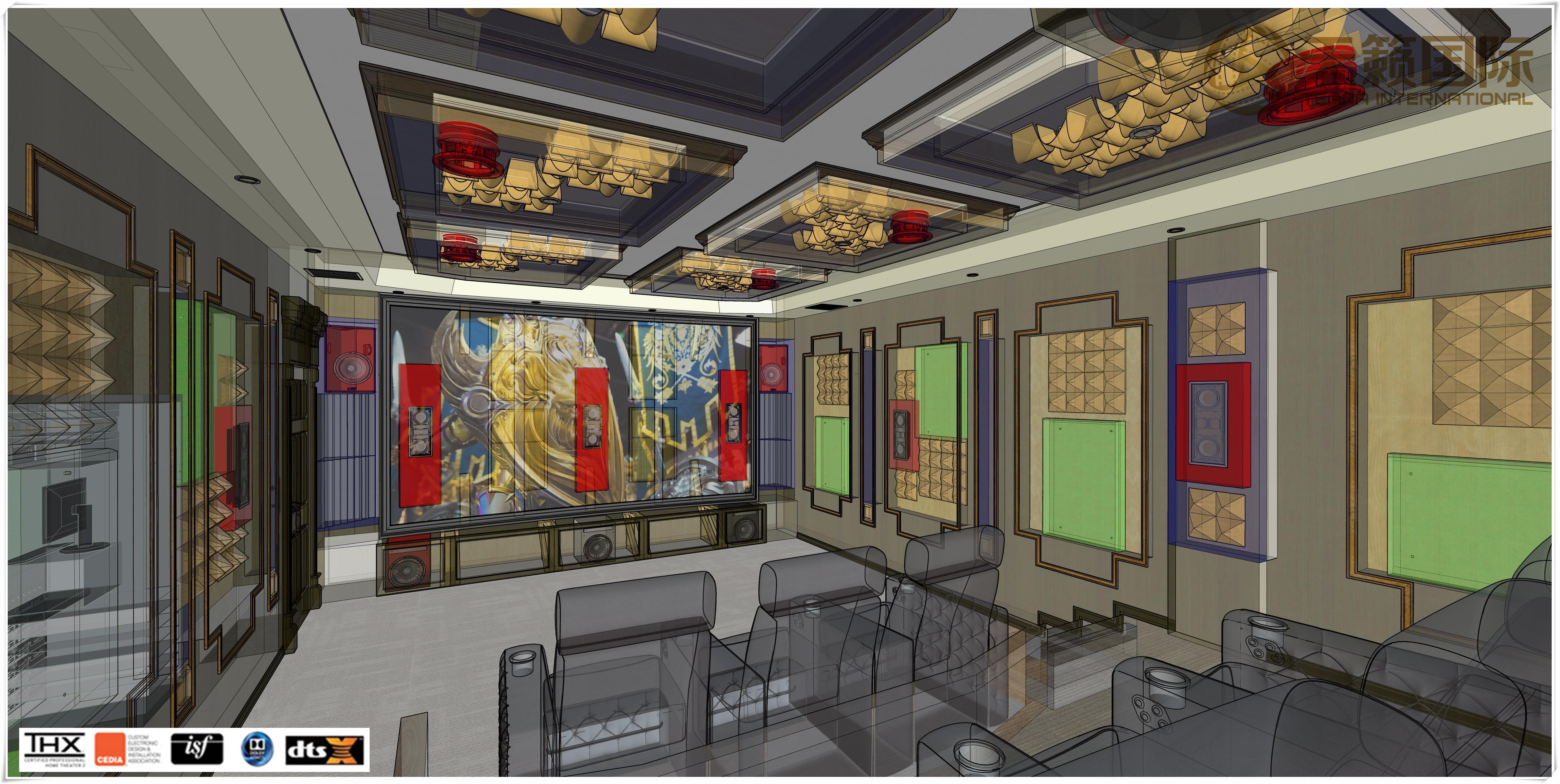 对于房间最难处理的低频驻波时间而言,结构性的声学设计远比材料吸扩的解决能力强大。在房间驻波得到良好调控下,影院系统的清晰度与能量感都得到有效的展现。中高频清晰度获得了良好的保证,多余的低频能量及房间颤动回声更得到有效的消减,让整间影院的声音更纯净,活跃。同时,经过灯光设计布置配合DALI系统的精细调光,保证了设计风格统一,装饰用料和色调搭配上显得相当精致高雅。
