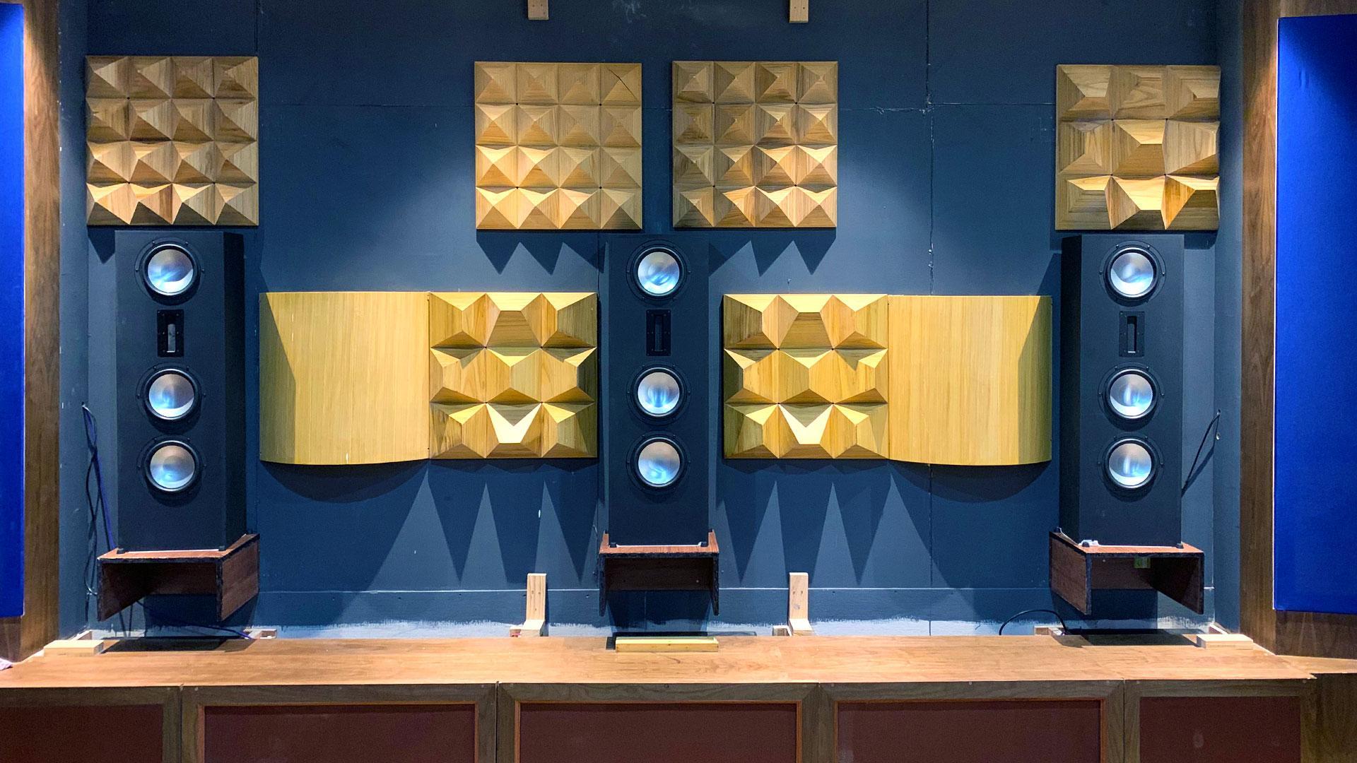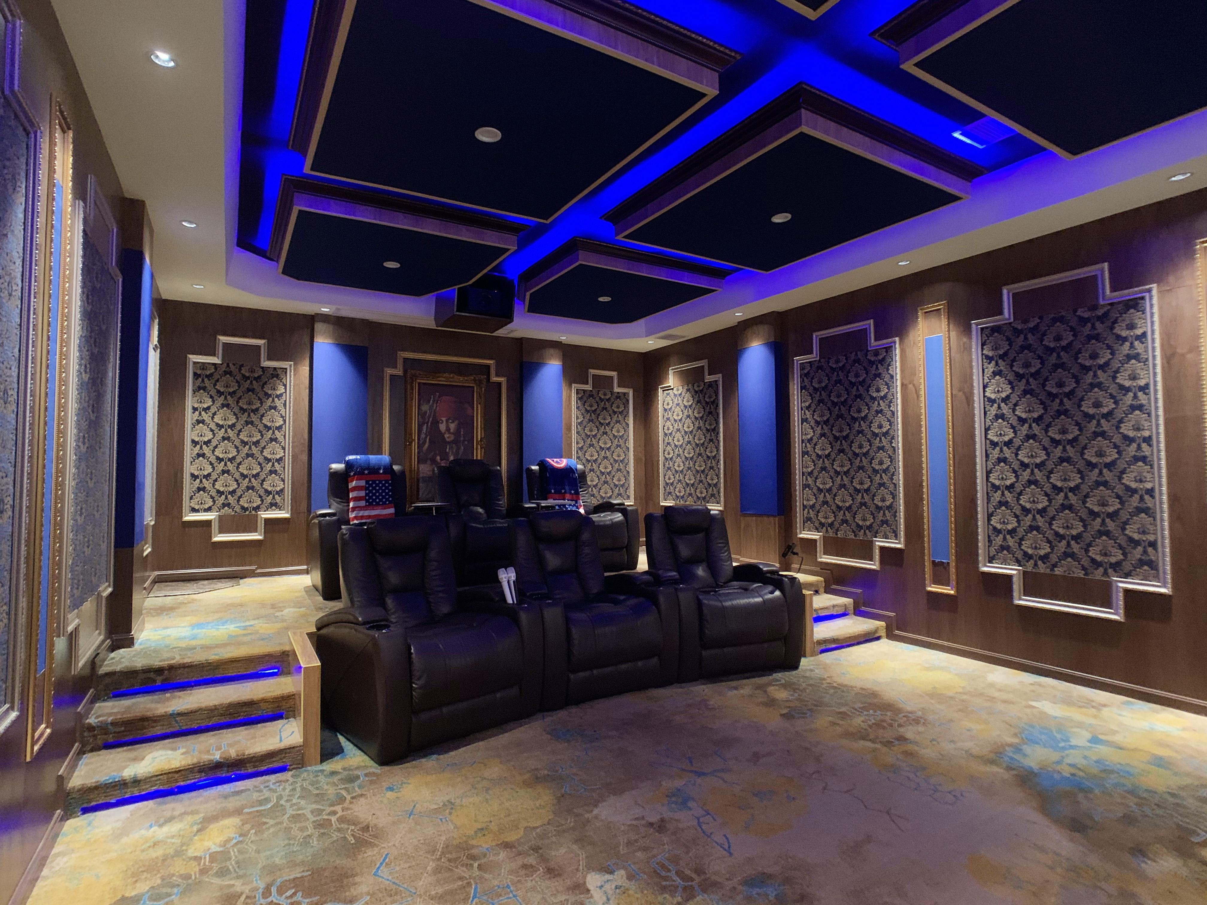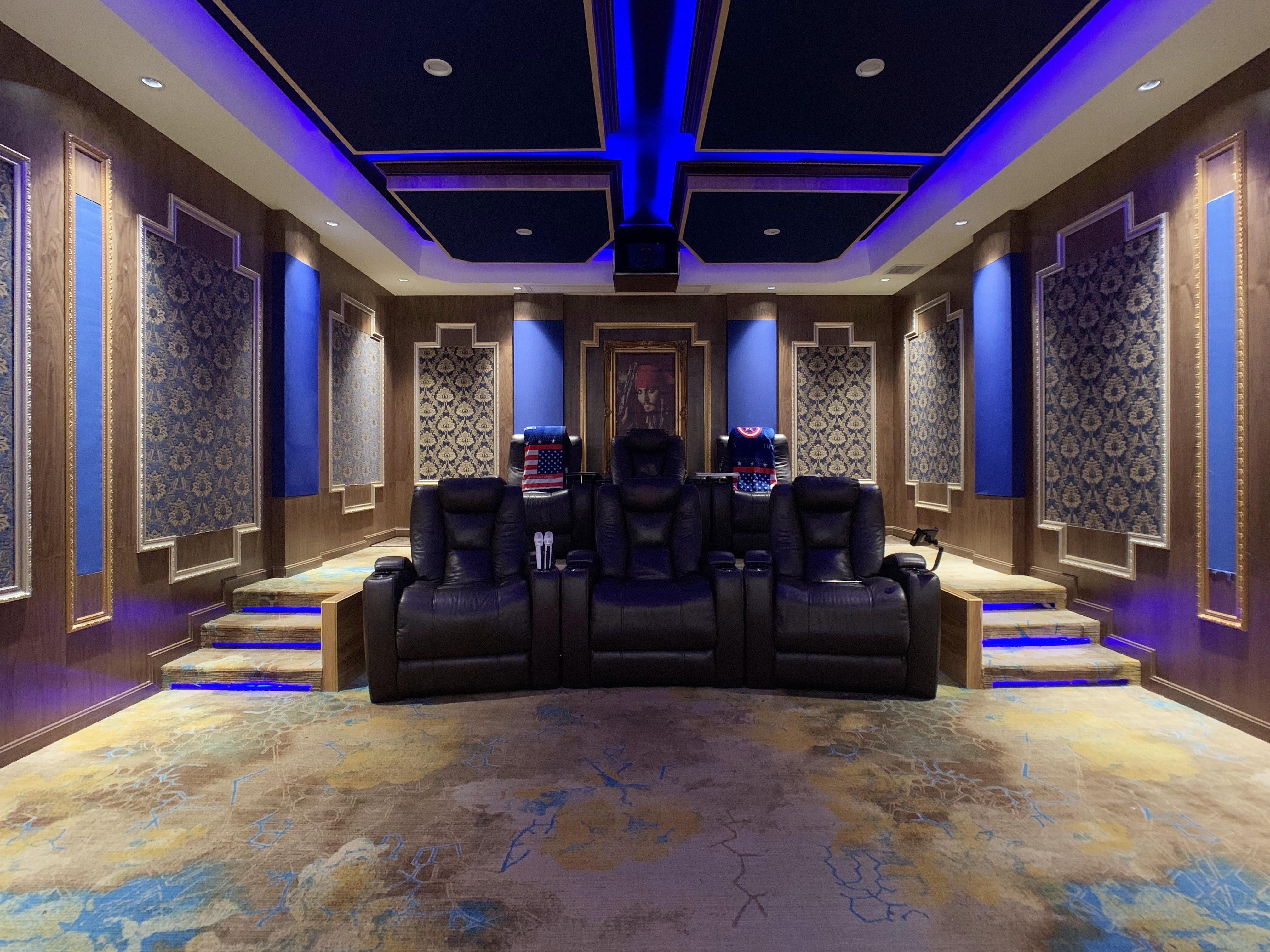 这间始建于2015年,并于2019年改造升级,占地43平米,具有优异长宽高比例的专业影院视听室,拥有让人眼前一亮的美式气派,墙身设计有雕花细致的装饰木面与花团锦簇的透声织物,地面铺有厚重的吸音地毯,辅予天花上六个深蓝色透声布饰面声学造型,并结合线条的运用给人以豪华影院的感觉。