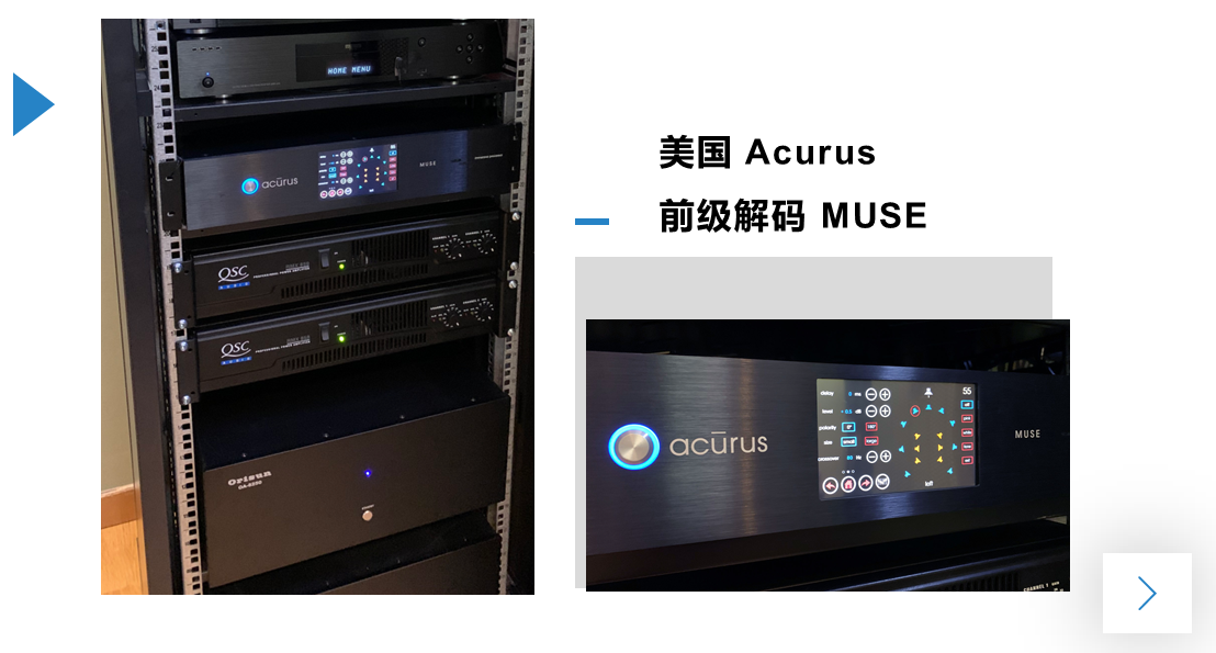 选用了Acurus(雅奇力)前级功放MUSE,其处理能力拥有十分出色的DSP选项,提供了功能强大的声场校正系统以及高清音频解码能力。在功能和性能上是多声道前级中的翘楚。