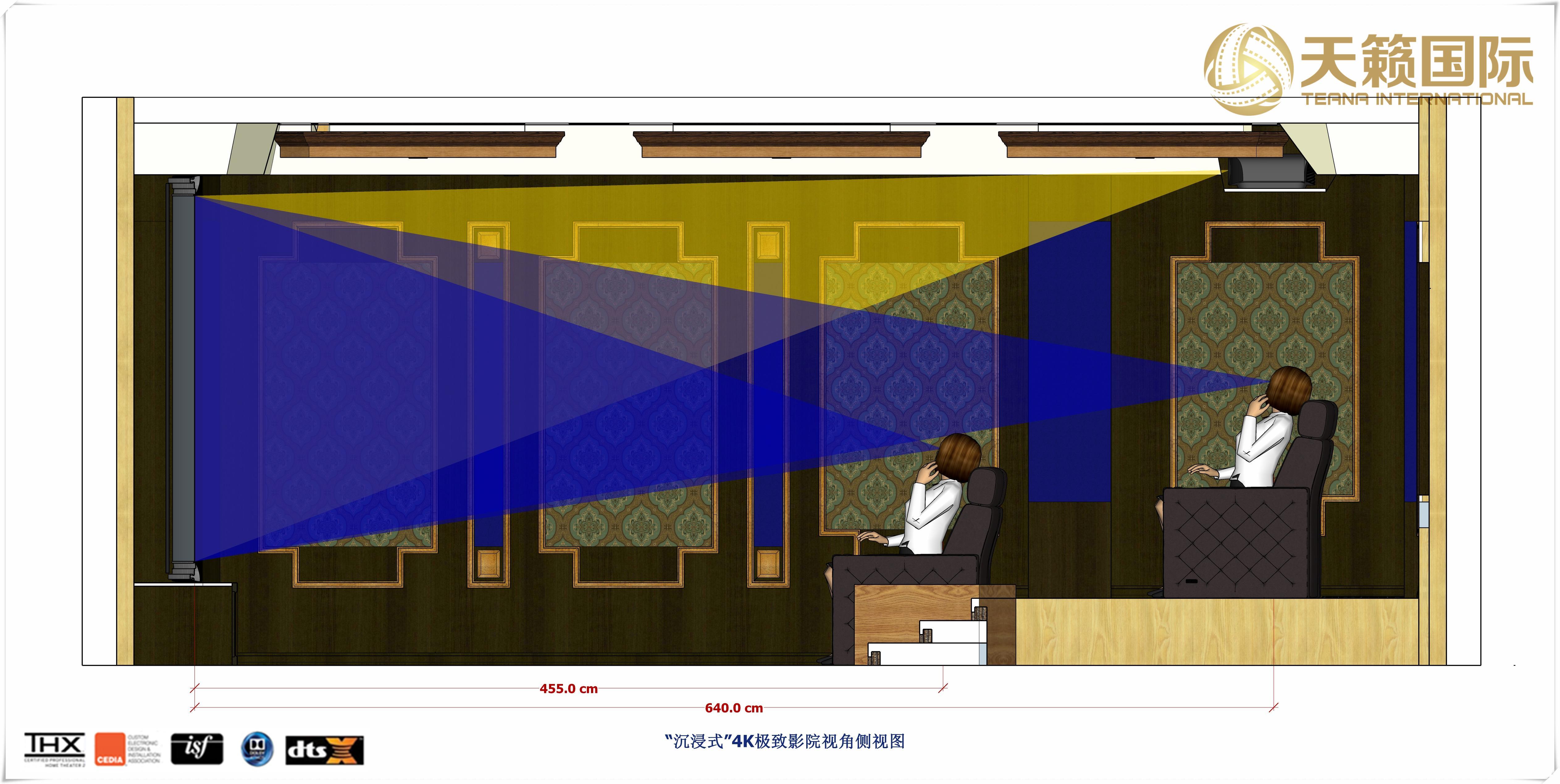 影院面积:标准的长宽比,7.72米X5.47米X3.2米,占地42平米
