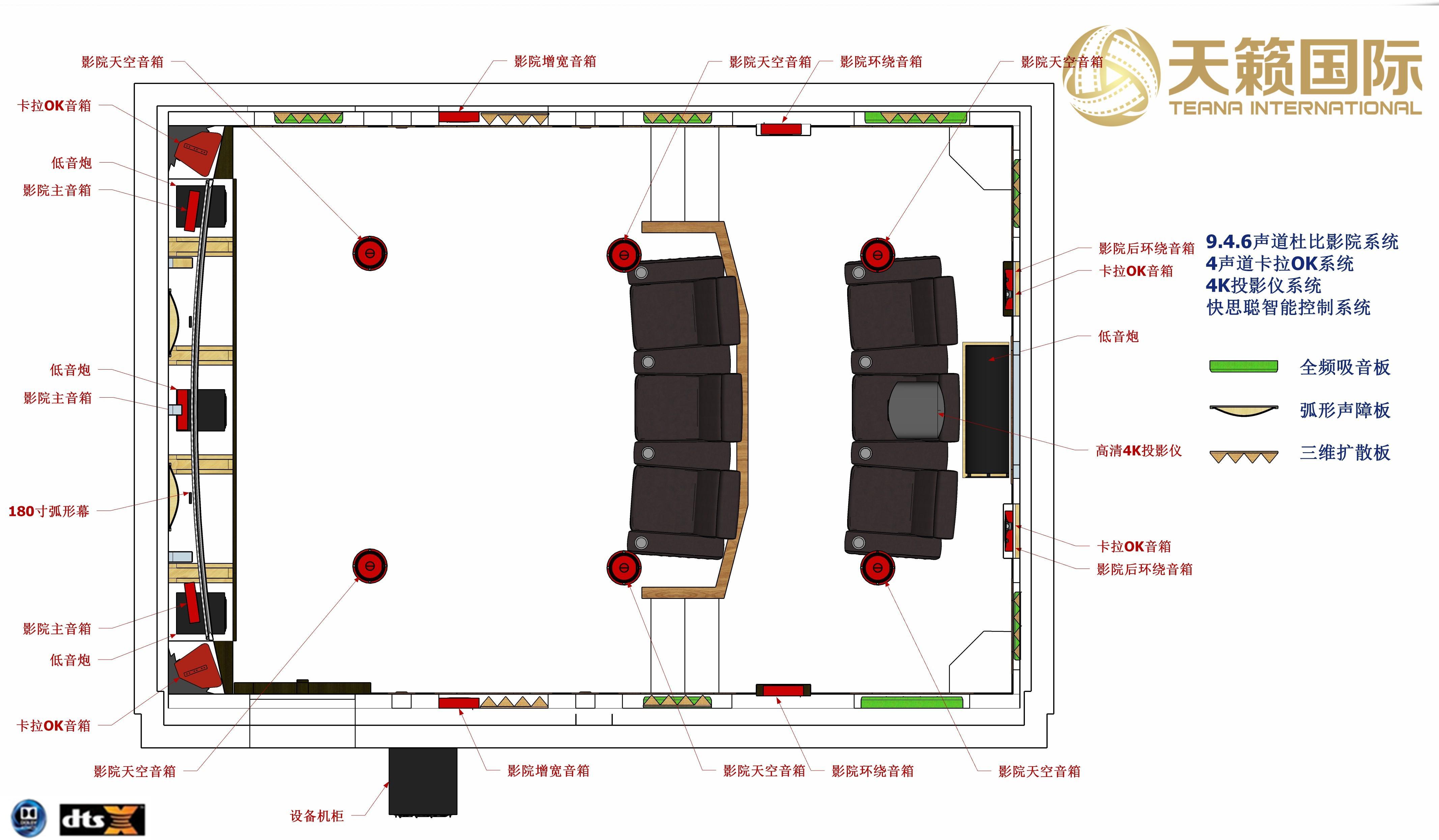 整个影院技术含量非常高,包含影院系统及卡拉OK设备在内,一共使用了23只扬声器,倚靠天籁国际影音强大的设计与技术能力,全部隐藏在墙身饰面和透声幕背后,在整个空间内看不到任何一只突兀在外的扬声器。