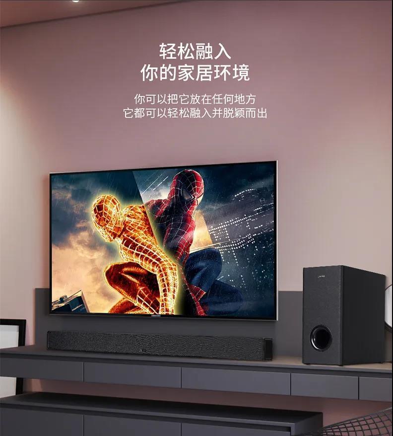 而第二类更多的是为AV机和影音设备接入而设计的,会加入全景声声效技术等,也就是说更偏重于影院声效(即使是Soundbar也能让你在客厅或小空间内感受到影院般的沉浸感),同时这类Soundbar也会适配低音炮和环绕,令你感受到不亚于真实多声道的虚拟效果。此外,这类产品的安装通常都十分简易,配件也很齐全,只需按照说明书即可完成安装。
