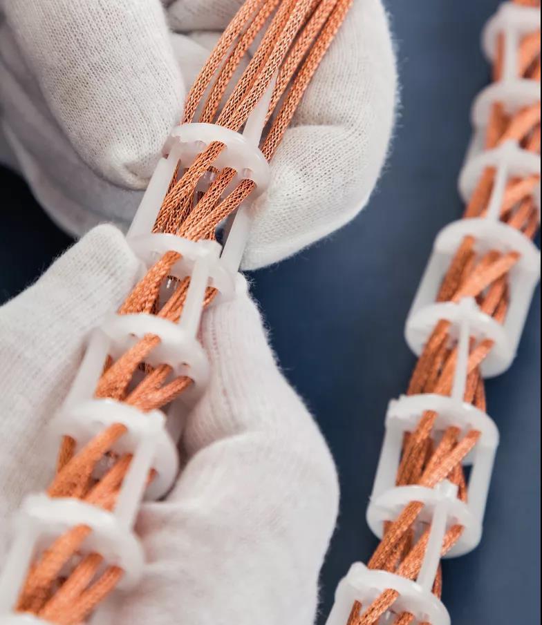 因为连接不同音响器材的线材其电容值对音质起着关键性的作用,讯源器材传来的讯号电平非常低,很容易受到高电容值线材的干扰,所以在Hi-End领域,空气是目前为止最佳的绝缘材料。空气绝缘可以获得非常低的电容值和绝缘损耗,这是讯号无染传输的关键因素,而其他任何在线材上使用的固体绝缘材料(例如PVC聚氯乙烯)都会造成线材电子特性下降。在理想的状态下,只有不使用绝缘材料才能够保证最佳的讯号传输性能,也就意味着线材导体之间完全由空气来绝缘,但是,在实际操作中很难实现,导体之间必须相互支撑才能形成可用的线材造型。同时,所以in-akustik品牌特别开发出了Air Helix(空气螺旋)这种线材导体连接技术。空气螺旋技术的原理非常独特,厂家设计了特殊的小夹子通过纯手工方式分段夹住线材导体,尽可能地模拟空气绝缘的理想状态。同时线夹支撑住每根导体,引导它们依次排列成特殊的螺旋环绕结构,让导体保持正确的延伸方向。此外,由于线夹与线夹之间采用了两组连接片,不仅使线夹相互连接,也保证了线夹间准确的间距,同时也让这种结构非常有弹性。