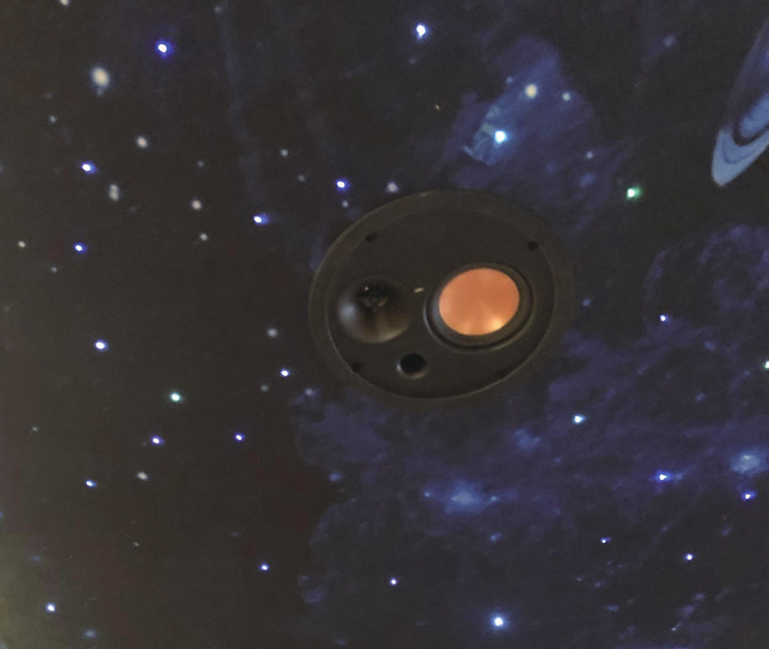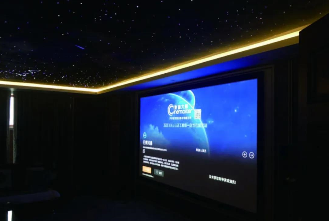 房顶的星空设计采用了整张喷绘星空并配合整体装修风格定制的图案,观影状态下,周围全黑,抬头看到的便是一片星空,感觉自己仿佛置身在美国天然桥国家保护区安静,无际且美好。Optoma RTF-5560-UHD投影出来的画面也非常清晰,色彩准确性强,画面基本上占据了整面墙,在每一个座位上一一体验,当然是中间的位置观影体验是最好的,但是其他角度所看到的画面也都非常完整清晰的。即使是把影院当作电视,只要把灯打开,看综艺、追电视剧,当客厅影院使用也是完全允许的。