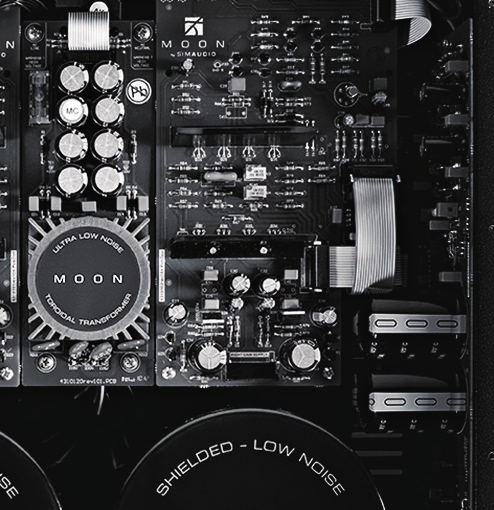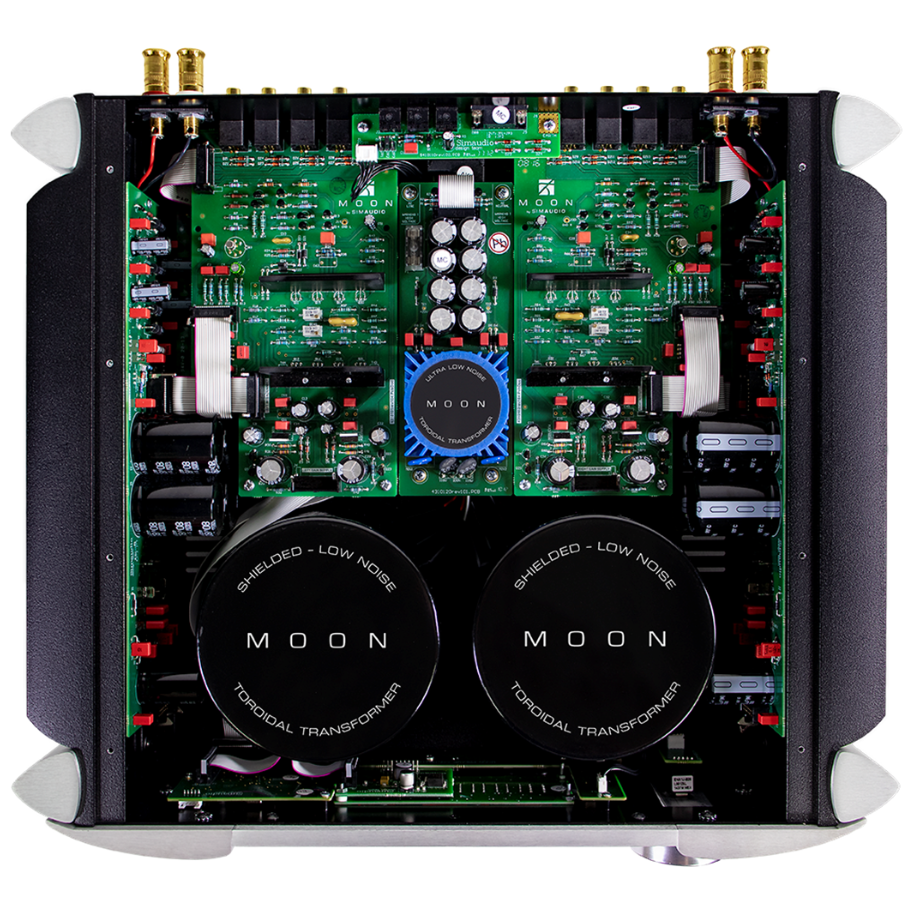 從背板上接線端子的左右對稱分佈情況,也許你會猜測Moon by Simaudio 700i合併式放大器的內部是左右鏡相的雙單聲道設計。一點沒錯!Moon by Simaudio 700i的內部是嚴格的左右對稱設計,最可觀的是電源部分,每個聲道分別使用了一隻容量500VA的巨型電源變壓器單獨供電,這體現出了Moon by Simaudio品牌的放大器設計理念,即:只有充足的電源供應,才能讓放大器發出自然而美妙的聲音。