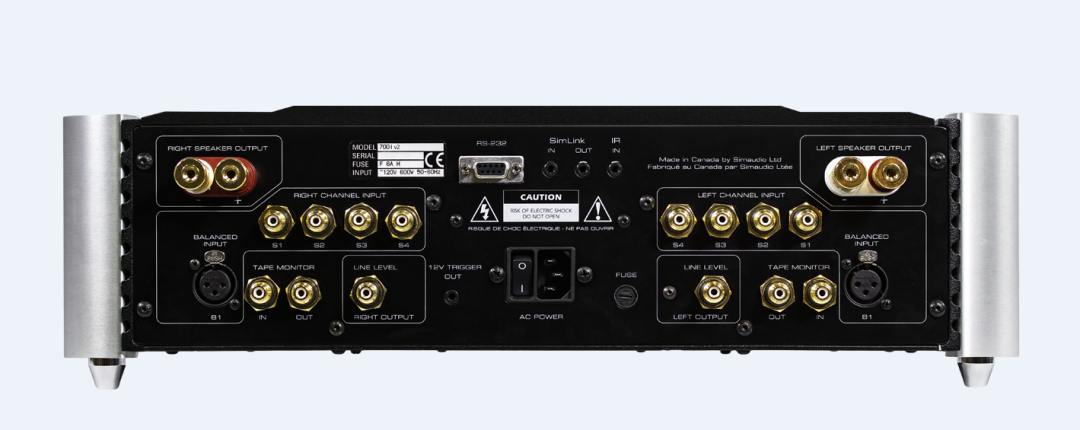 背板上,Moon by Simaudio 700i合併式放大器具備4組RCA電平輸入端子和1組XLR全平衡輸入端子,同時還具有1組錄音監控輸出/輸入端子,以及1組線路輸出端子供外接純後級放大器使用。此外,超大型的揚聲器接線柱也可以接插大線徑的揚聲器線。