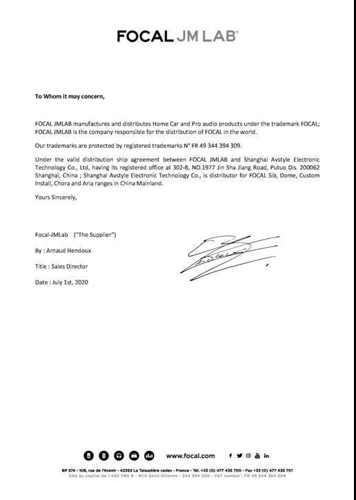 2020年7月法国FOCAL正式委任上海爱威影音电子技术有限公司为Home Classic Lifestyle,Home CI,Home Cinema三大类产品的中国内地总代理,负责相关FOCAL产品的推广、销售以及相关售后服务。
