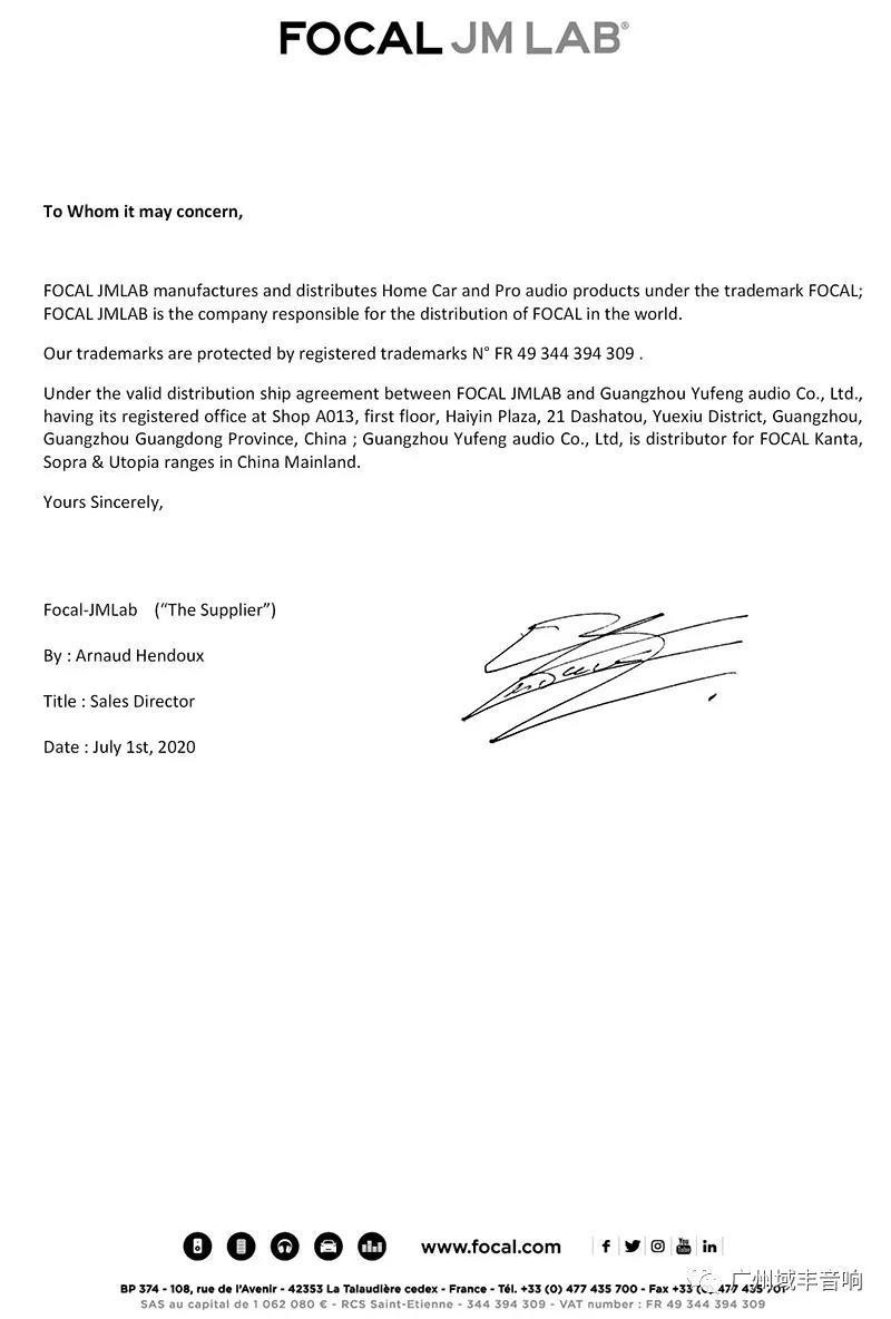 2020年7月1日法國FOCAL(法國焦點勁浪)正式委任廣州域豐音響有限公司為FOCAL Kanta、Sopra & Utopia 三大高端系列產品的中國內地總代理,負責相關FOCAL產品的推廣、銷售以及相關售後服務。