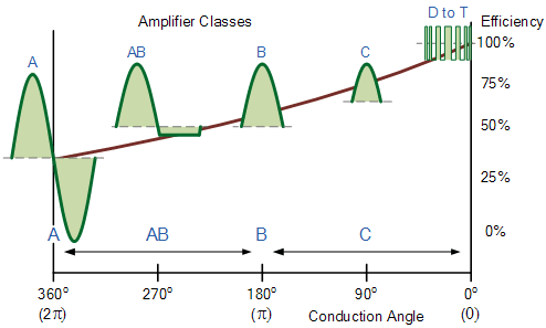 在介绍新世代的放大器类型前,我还是先介绍一下我们传统的放大器类型。依照三极管在放大信号时的信号工作状态和三极管静态电流大小的划分,放大器电路主要有3种类型:一是甲类(A类)放大器电路、二是乙类(B类)放大器电路、三是甲乙类(AB类)放大器电路、D类放大电路、H类放大电路等。