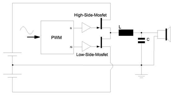 D类的设计,很多朋友会说在低音炮上见得特别多,是的!D类的特点就是可以制造极高的输出功率,且功耗极低。D类放大器的输出级在正电源和负电源之间切换从而产生一串电压脉冲,这种波形有利于降低功耗,因为当输出晶体管在不导通时具有零电流,并且在导通时具有很低的VDS,因而产生较小的功耗LDS×VDS。由于大多数音频信号不是脉冲串,因此必须包括一个调制器将音频输入转换为脉冲信号,脉冲的频率成份包括需要的音频信号和与调制过程相关的重要的高频能量。经常在输出级和扬声器之间输入一个低通滤波器以将电磁干扰(EMI)将至最小,并且避免太多的高频能量驱动扬声器。