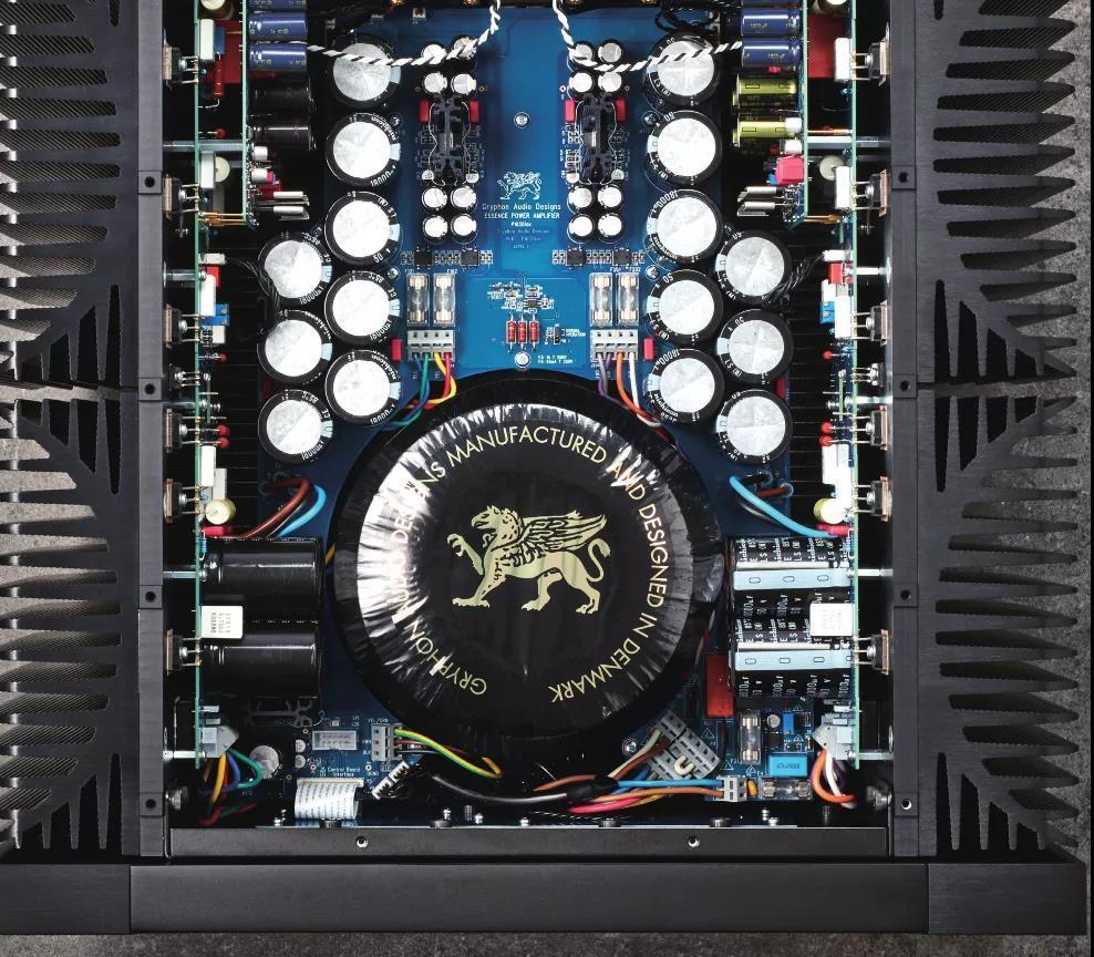打开Essence 后级放大器的黑色铝合金顶板,一枚直径接近8英寸,容量高达 1350VA 水平的特制环型供电变压器随即出现在眼前,搭载440000μF的庞大电容阵作为能量储备,各级退耦环节亦不吝出动发烧级聚丙烯薄膜电容。务求加强器材稳定度,Gryphon 工程团队特别为Essence纯A类后级放大器加入软起动线路,配合不会对音效构成任何影响的非入侵性保护设施,为用家提供更周全保障。