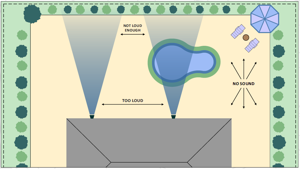 很多人在配戶外背景音樂的時候,往往會簡單的搭配幾隻音箱,這樣的缺點是:會造成靠近音箱的地方聲音太響,離開一定的距離後聲音又太輕,聲場覆蓋不均勻,會讓在花園活動的人感覺不適,聆聽體驗非常的差。