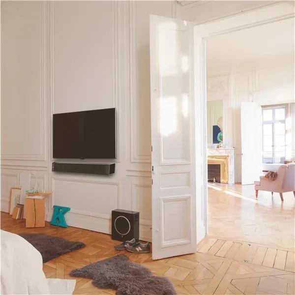 什麼樣的設計才能符合好Soundbar的條件?我心裏面設想了幾個標準,第一、尺寸不能太大,不然就很難在客廳里擺放;第二、擺設要方便,可以擺在電視下面,還要可以壁掛;第三、要有足夠的輸入輸出端子,才能連接客廳裏面各式各樣的影音產品,包括BD、PS4、Xbox等等。這些條件,Dimension全部都具備,特殊的斜角設計,讓Dimension可以平放,可以壁掛,甚至可以擺在電視上面。
