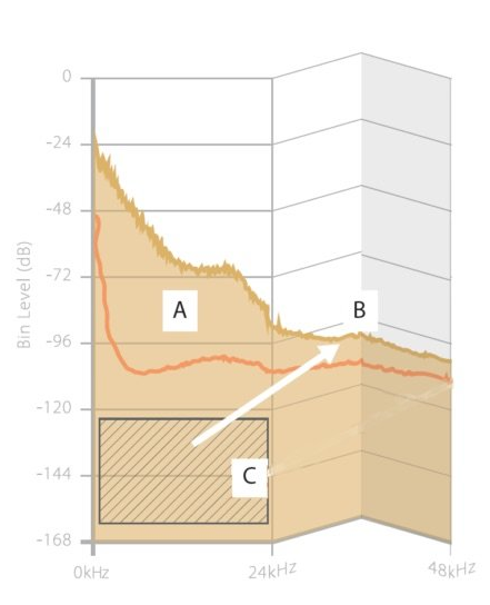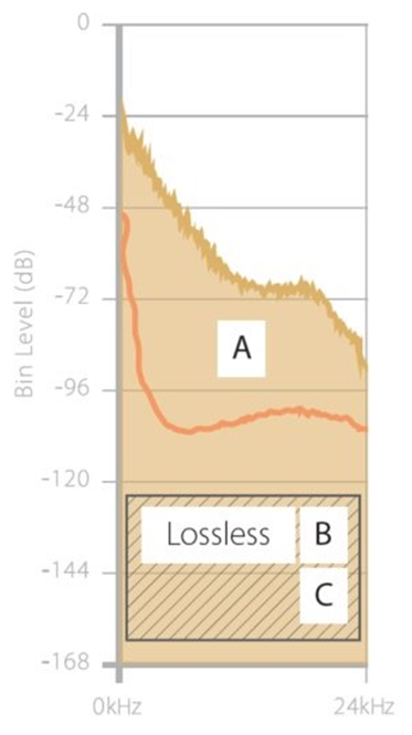 很多朋友会十分好奇MQA是通过算法如何把音乐文档进行多重“折叠”实现更高的容量“压缩”,譬如以24kHz以上的极高频声音信息为例,以编码方式藏到0Hz-24kHz的频宽之中,并改装成小音量讯号,而Bob Stuart是用一个很简明的方式来向大家说明,他说MQA就好像一张纸,上面承载了Hi-Res音乐讯号的所有信息,折叠(fold)之后,它所占文档大小就只有原本的一半,解码时只要再将纸张展开(unfold),你就可以得到原始的信息量。而MQA的特色就是可以“折叠”、“折叠”、“再折叠”,让文档信息缩小、缩小、再缩小。