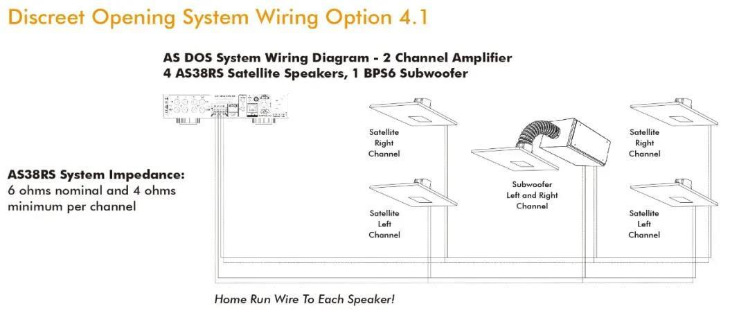 ↑图注:DOS系统只需搭配1台2声道的功放,就可以轻松组建4.1系统,系统阻抗在6Ω左右