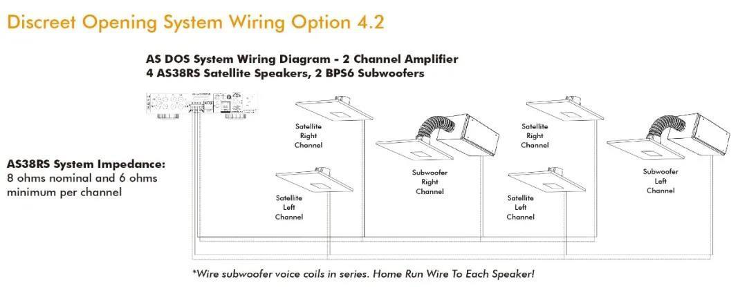 ↑图注:如果环境较大或需要更强的低音衬托,DOS系统可以再加1个低音炮,组成4.2系统,系统阻抗在8Ω左右