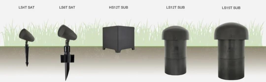 ↑图注:户外景观系列中的SLS系统,包括LS4T SAT、LS6T SAT卫星音箱、HS12T SUB、LS12T SUB、LS15T SUB低音炮