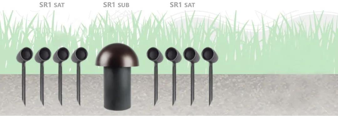 ↑图注:SR1系统包括8个SR1 SAT卫星音箱与1个SR1 SUB低音炮