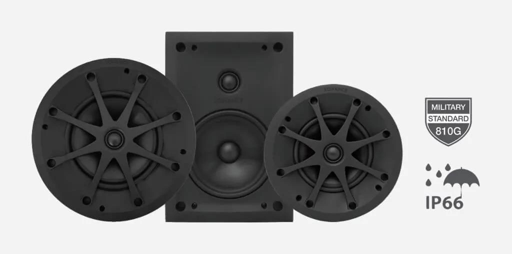 此外,岩石系列采用了耐用的喇叭单元、紫外线和抗风化的材料,非常适合用于泳池旁或其他恶劣的环境之中。Mariner壁挂系列则是用于安装在庭院露台之上。Sonance Visual Performance Extreme极端环境嵌入式系列可承受-34ºC至+79ºC的极端气温,具备IP-66的防水等级,符合美国810G军用标准。如果你生活在海边、沙漠或极圈附近的城市,这个系列绝对是可以让你长时间舒心使用的背景音乐音箱之选。