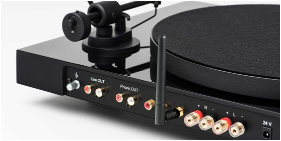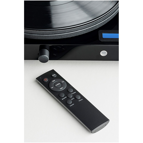 这款Juke Box E唱盘集合了很多功能,从背面接口就可以了解。Line Out可以让经过内部唱放初次放大的模拟信号输出给前级等设备,而Phono Out则可以让Juke Box E唱盘接上独立外置的唱头放大器。我们还可以看到Line in输入,也就是把黑胶唱盘作为纯粹的功放功能,然后让模拟信号进行放大。黑色天线用于接收无线蓝牙信号,让手机/平板电脑音乐信号无线传输到Juke Box E唱盘中进行放大。由于黑胶唱盘已经合成了放大器功能,因此音量旋钮也直接设计在黑胶唱盘上,因此你会发现操作十分简便,而且还有遥控远程控制。