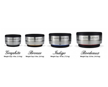 接触过ISOAcoustics之后,让我清楚明白该品牌处理谐振的原理是用不同聚合物处理不同重量的器材带来的谐振。而当中的OREA系列,则是为音响器材处理谐振。专为家用Hi-Fi而设的脚垫OREA也是ISOAcoustics力推的产品。此系列产品针对不同重量的喇叭和器材划分了不同型号,其效果和对音色的润色更是明显。OREA 系列推出了四款产品:Graphite、Bronze、Indigo 和 Bordeaux,每一款均以承重量计算,Graphite 每个适合承重重量为1.8kg、Bronze 每个承重重量为3.6kg、Indigo 每个承重重量为 7.2kg、Bordeaux每个承重重量为 14.4kg。当然如果你选中的器材只有三个脚钉的话,将重量x3,四个脚垫位则x4,以此类推。