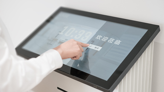 走进设计感十足的弧形玻璃门,映入眼帘的是TEOS自助接待系统与索尼BRAVIA 4K商显方案结合的“智能前台”。