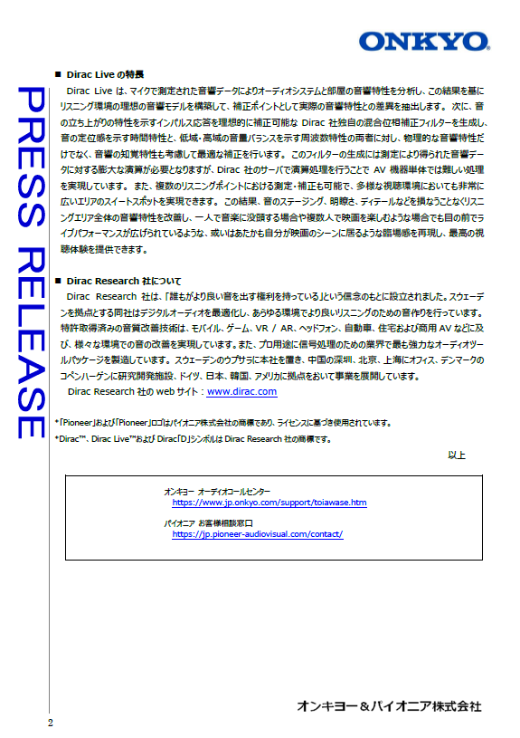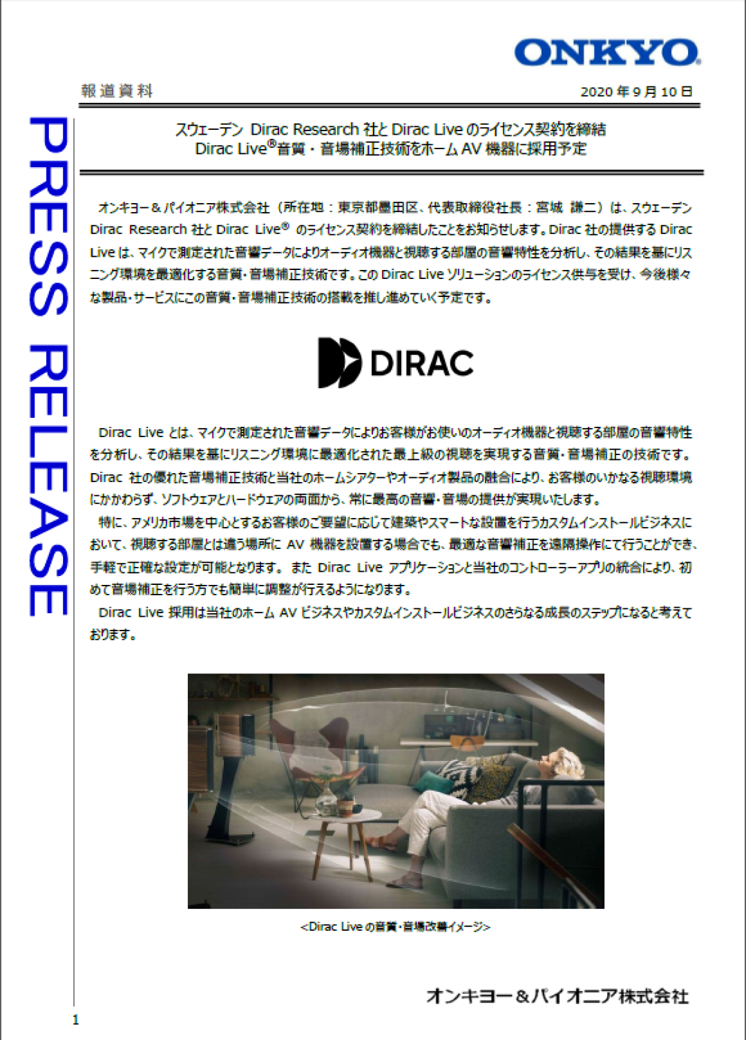 安桥&先锋株式会社 (所在地:东京都墨田区,代表董事社长:宫城谦二) 与位于瑞典的Dirac research公司就Dirac live®音质、音场AV设备追加技术签订授权合同。Dirac公司提供的DiracLive®技术通过麦克风测量的声音数据分析音频设备和设备所在房间/空间的声音特性,并基于测量结果来分析音场的特性,是优化环境的音质和音场修正技术。