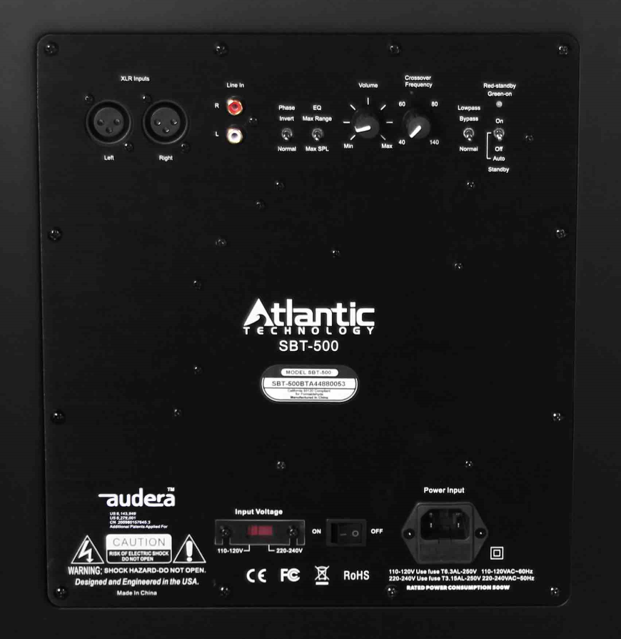 整套系统搭配的超低音也是Atlantic Technology的SBT-1000,它搭配双12英寸低音单元,SBT系列扩展了Atlantic在设计超低音方面的传统,可在不牺牲细节的情况下将功率和冲击力提升到一个新的水平。SBT系列采用双低音扬声器,更高功率和新的数字电路设计,采用最新技术和最优质的组件进行设计,可将音效提升到深度,功率和清晰度的新水平。双长冲程复合锥低音单元,每个单元均配有通风的电动机结构和2英寸高温4层音圈。这种强大的驱动器设计具有非常坚固的锥体,在整个工作范围内,其作用类似于活塞。其庞大的电磁电机组件和高温组件可提供出色的性能和可靠性。