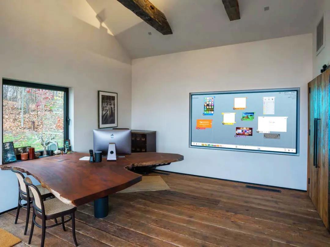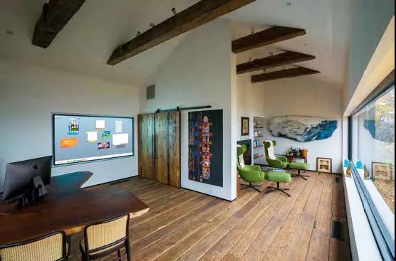 Gilmore回忆起在车道尚未浇筑好之前,他的团队不得不将设备机架和 98英寸的等离子电视机 (装有T1V协作软件供办公室使用 ) 运进谷仓时的情形。“为了到达谷仓,我们扛着那些设备在黏湿的草地上艰难穿行,直到一位农场工作人员用他的皮卡车拯救了我们。” 他记得。“这不是300磅以上板条箱的典型入户方案。”